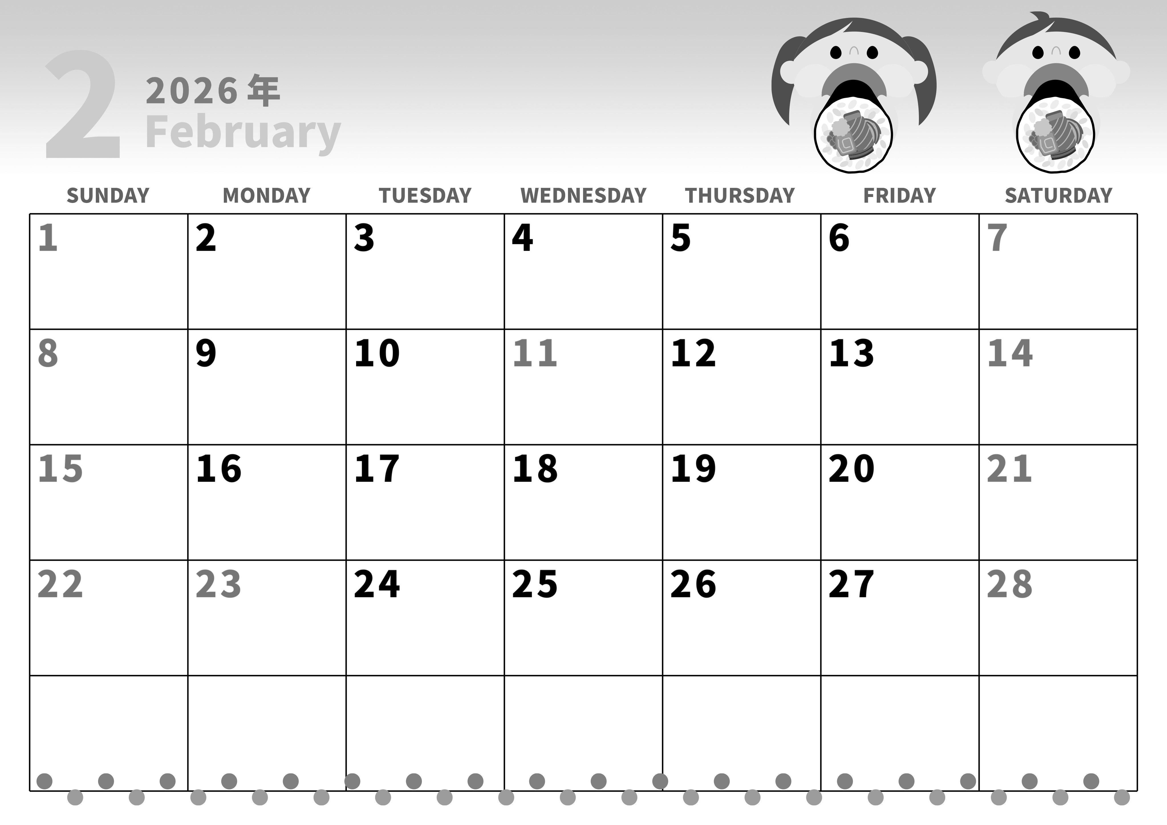 2026年2月横型モノクロの日曜始まりの無料テンプレート白黒カレンダーです。大きなお口をあんぐりと開けて恵方巻きを食べる男の子と女の子のかわいいイラスト付き白黒カレンダーです。ふたりともおいしそうにむさぼっているデザインに癒されます。(2026-00280200)