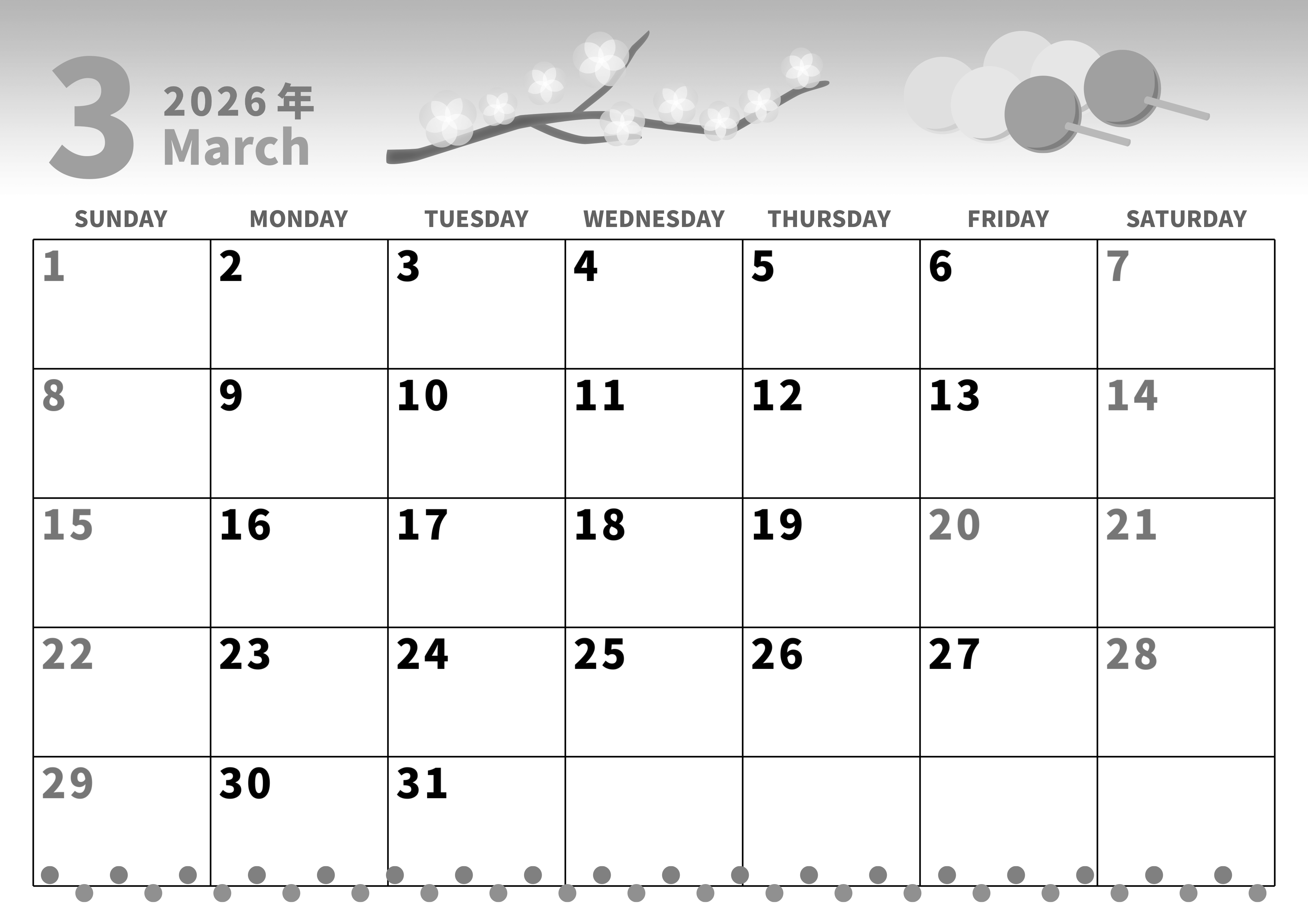 2026年3月横型モノクロの日曜始まり 三色団子イラストのかわいいA4無料白黒カレンダー(2026-00280300)