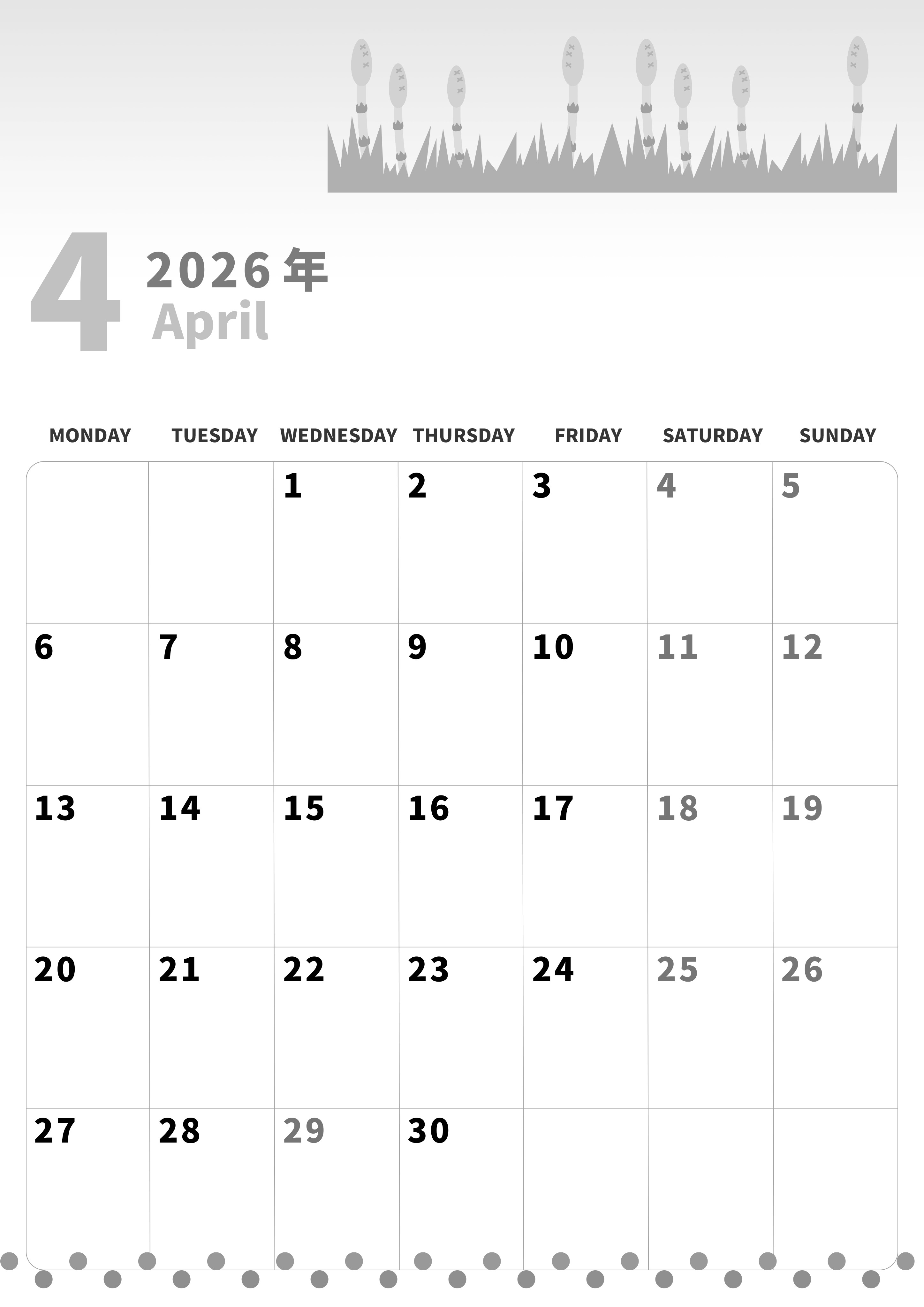 2026年4月縦型モノクロの月曜始まりの無料テンプレート白黒カレンダーです。罫線が黒色でくっきりしている実用的な白黒カレンダーです。それでいてつくしのイラストもも小さくてかわいいデザインとなっています。(2026-00280411)