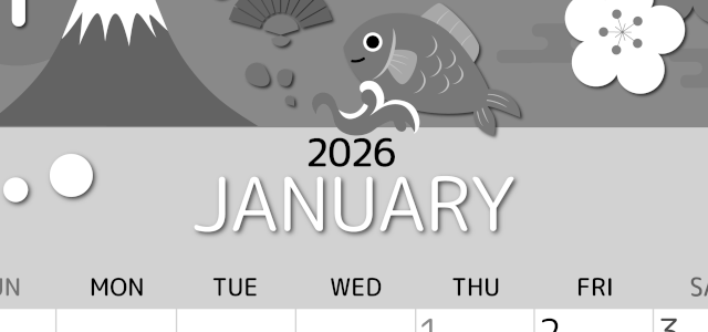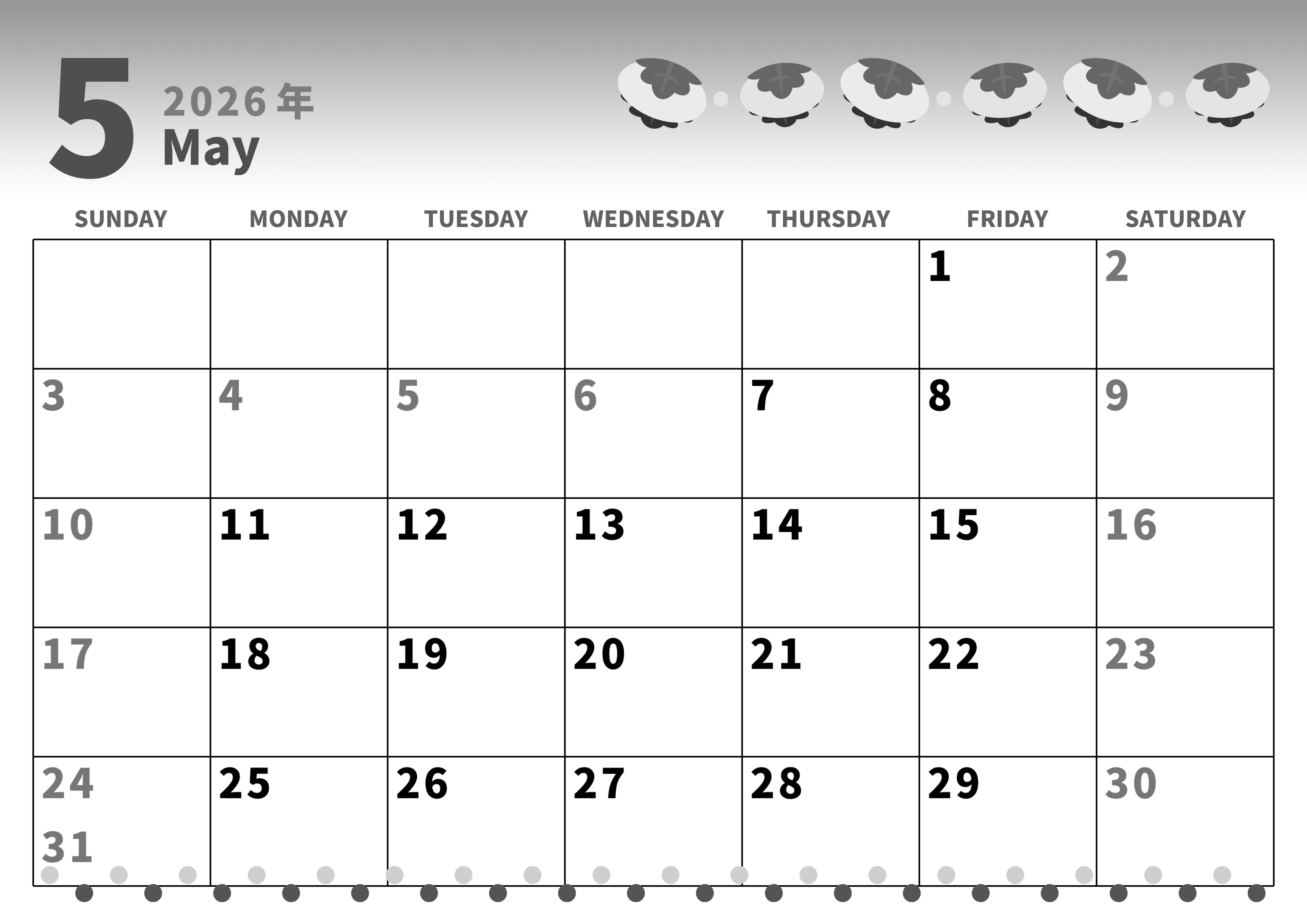 2026年5月横型モノクロの日曜始まりの無料テンプレート白黒カレンダーです。柏餅が並んでいるイラストがおいしそうでかわいい無料でダウンロードが行えるA4サイズの汎用的な白黒カレンダーテンプレートです。(2026-00280500)