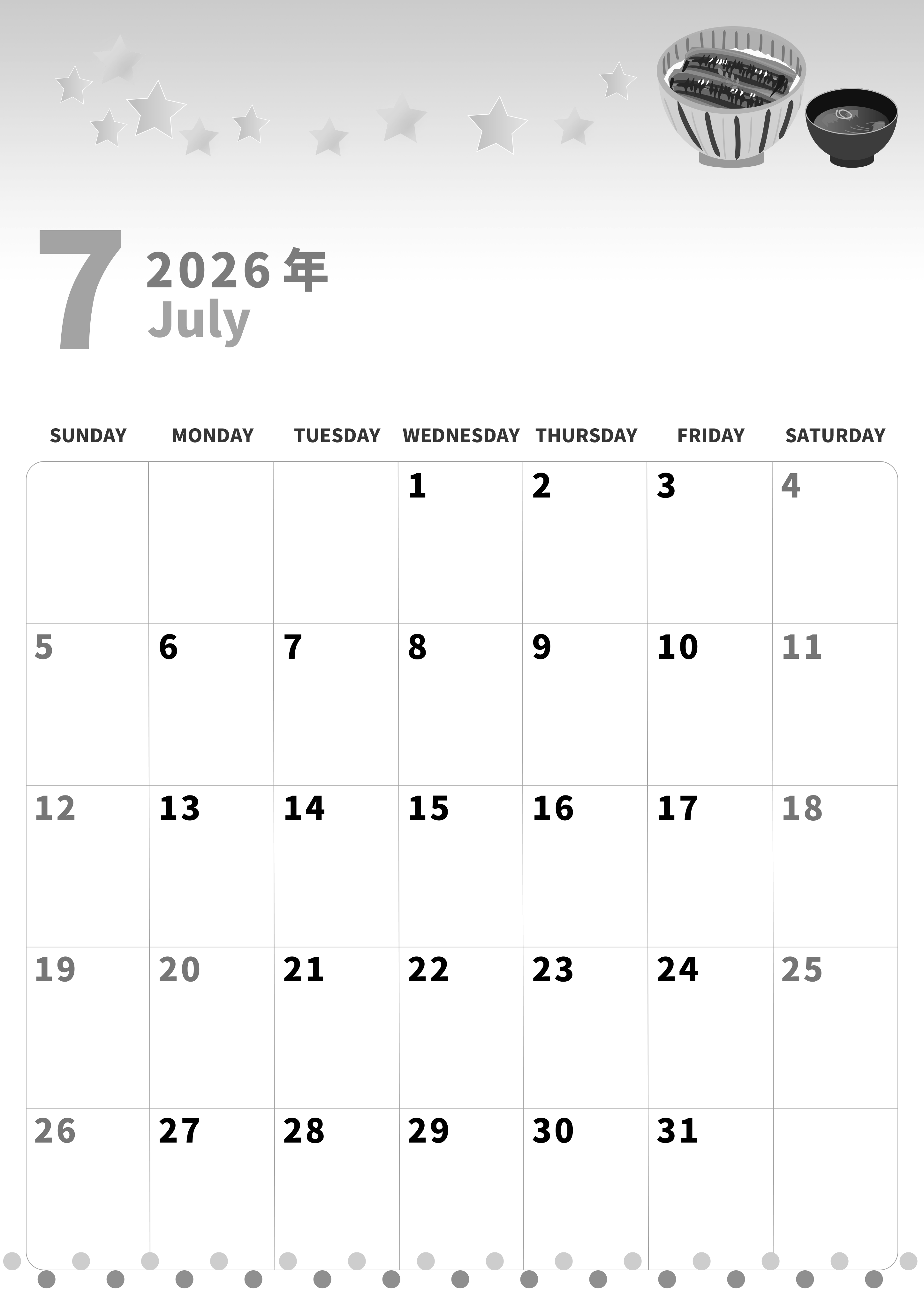 2026年7月縦型モノクロの日曜始まり 土用イラストのかわいいA4無料白黒カレンダー(2026-00280710)
