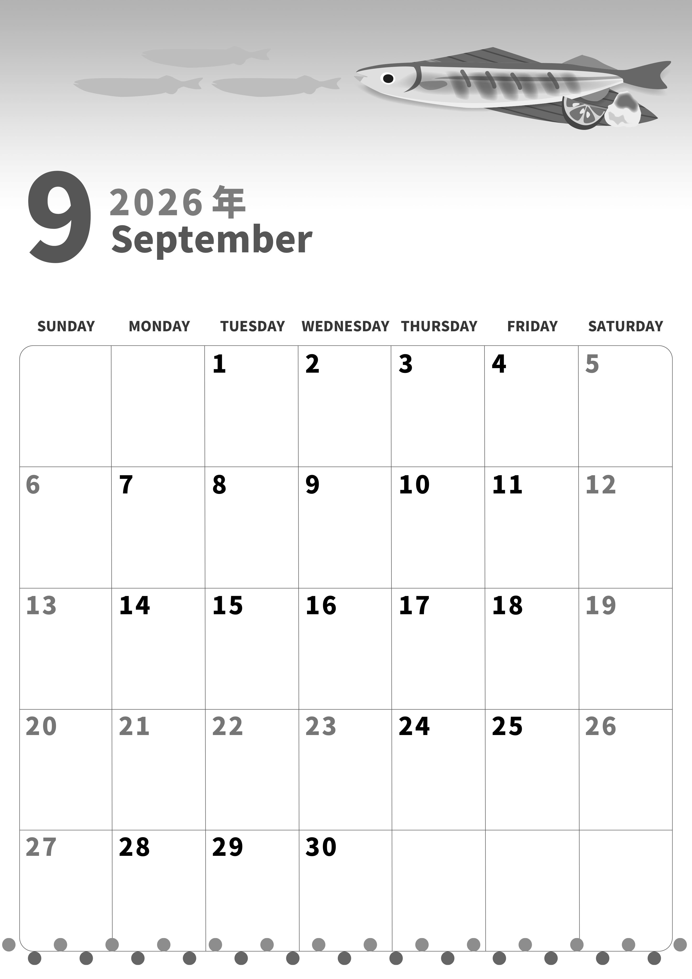 2026年9月縦型モノクロの日曜始まり 秋刀魚イラストのかわいいA4無料白黒カレンダー(2026-00280910)