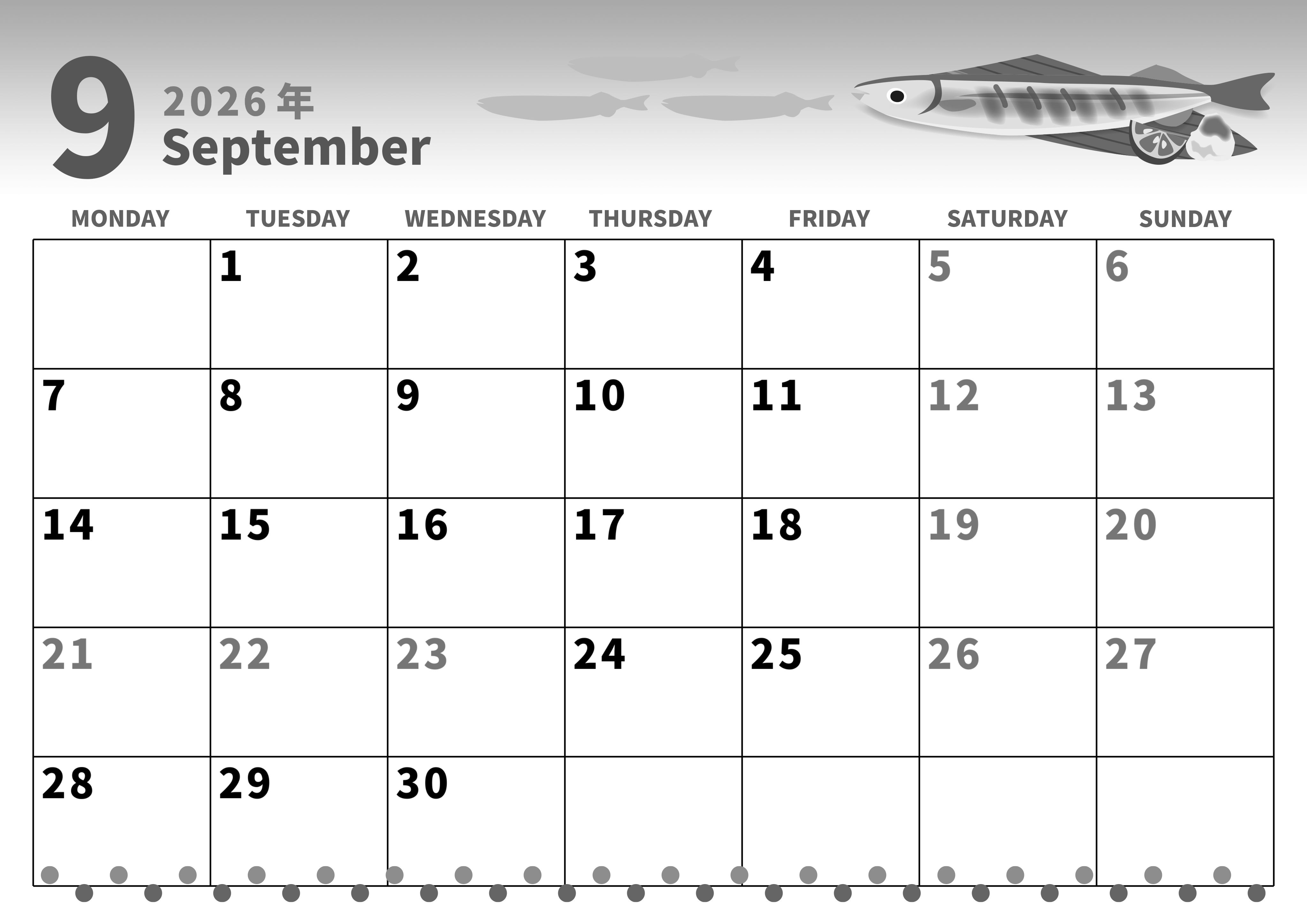 2026年9月横型モノクロの月曜始まりの無料テンプレート白黒カレンダーです。月曜始まりで文字の色分けが曜日によってなされているので計画を管理し易いレイアウトの白黒カレンダーです。イラストはおいしそうな焼き秋刀魚です。(2026-00280901)
