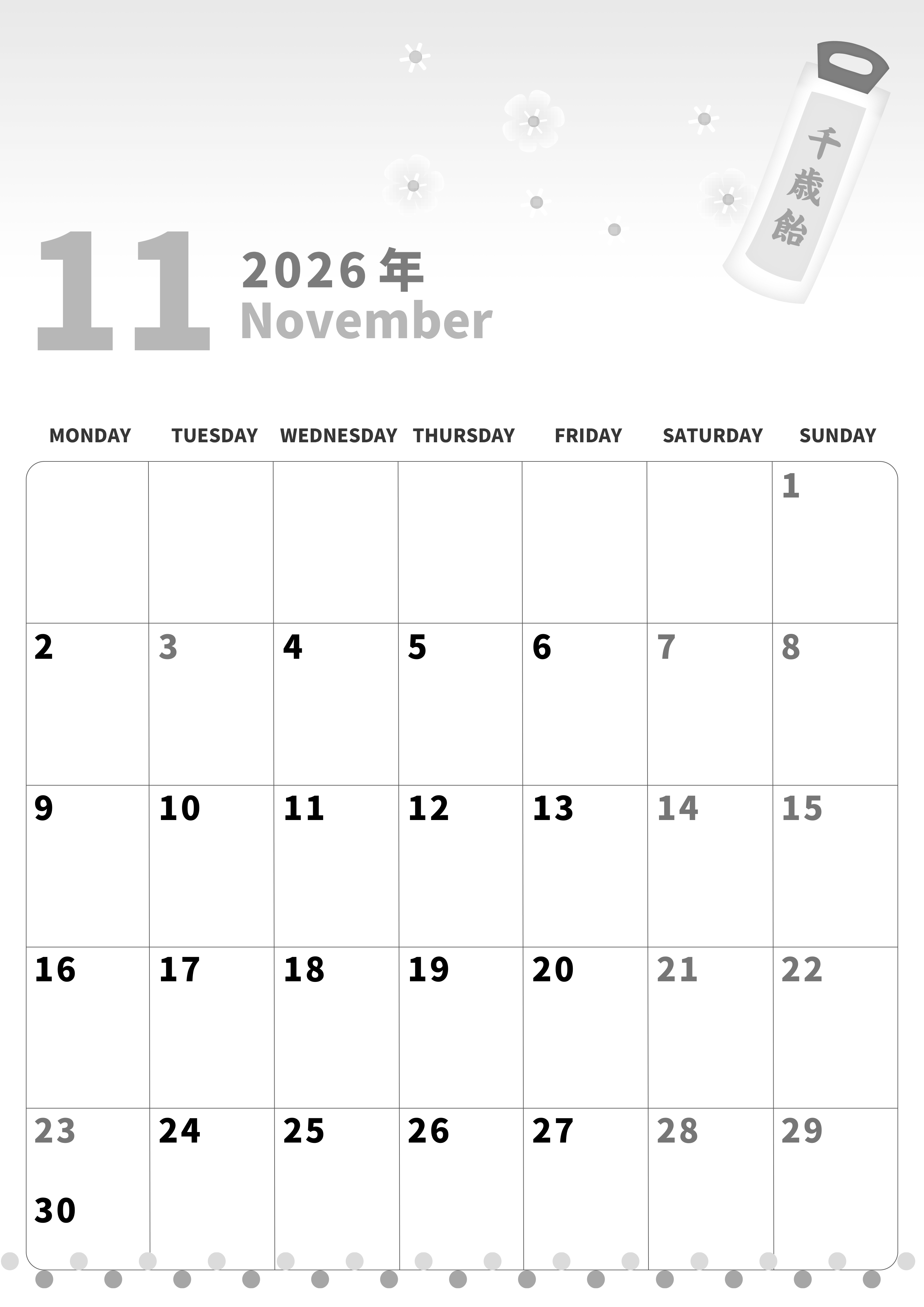 2026年11月縦型モノクロの月曜始まり イラストがかわいいA4無料白黒カレンダー(2026-00281111)