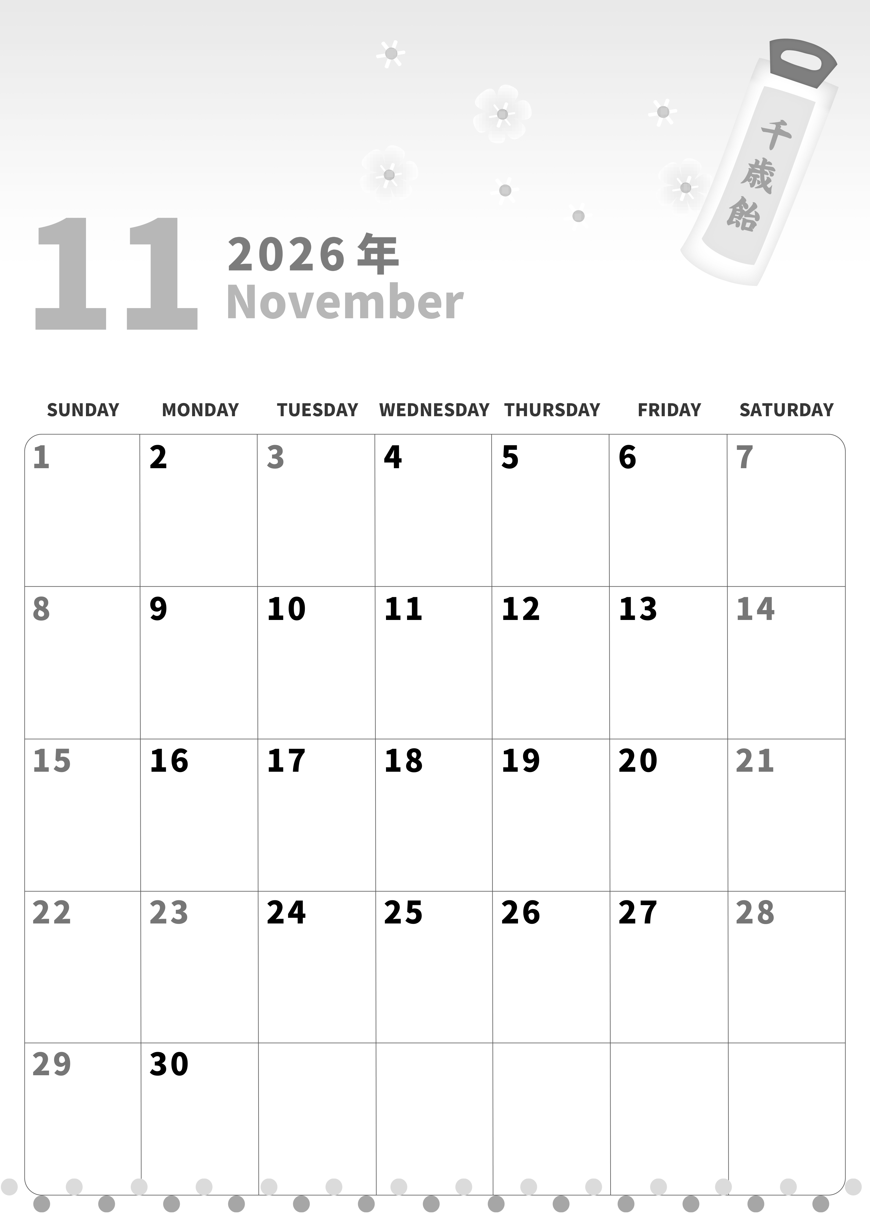 2026年11月縦型モノクロの日曜始まりの無料テンプレート白黒カレンダーです。曜日によってフォントの色を使い分けているので利便性が高い白黒カレンダーです。それでいてイラストもかわいいデザインです。(2026-00281110)