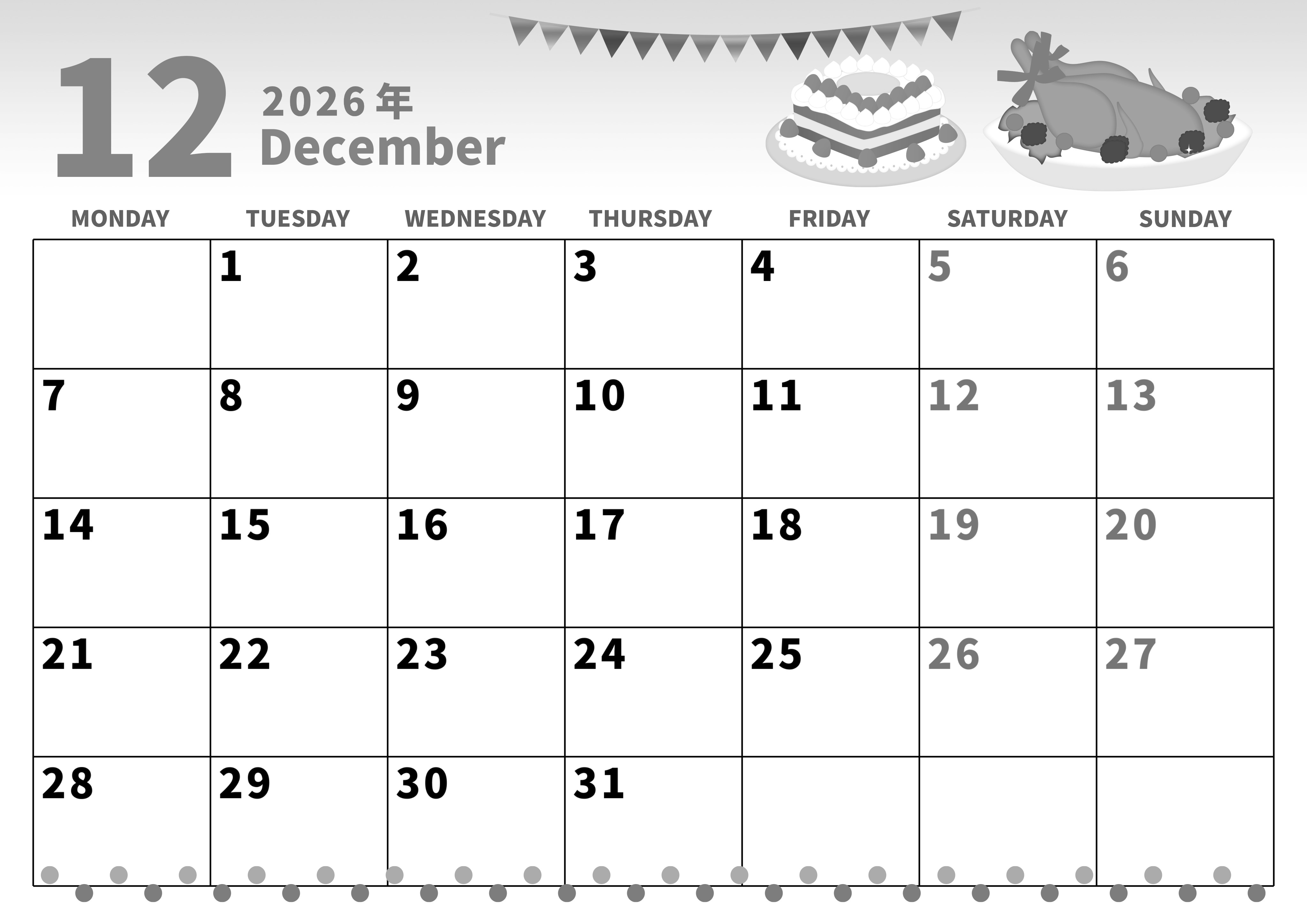 2026年・無料のカレンダーテンプレート 2026年12月横型モノクロの月曜始まり 七面鳥イラストのかわいいA4無料白黒カレンダー(2026-00281201) 素材状デザイン王 2025年4月1日 2026年12月横型モノクロの月曜始まりの無料テンプレート白黒カレンダーです。七面鳥の丸焼きを食べたくなるような食欲をとても刺激されるかわいいイラスト付きのフリー素材となっています。(2026-00281201) 12月 横型のカレンダー 月曜始まり 白黒 カレンダーデザイン-0028