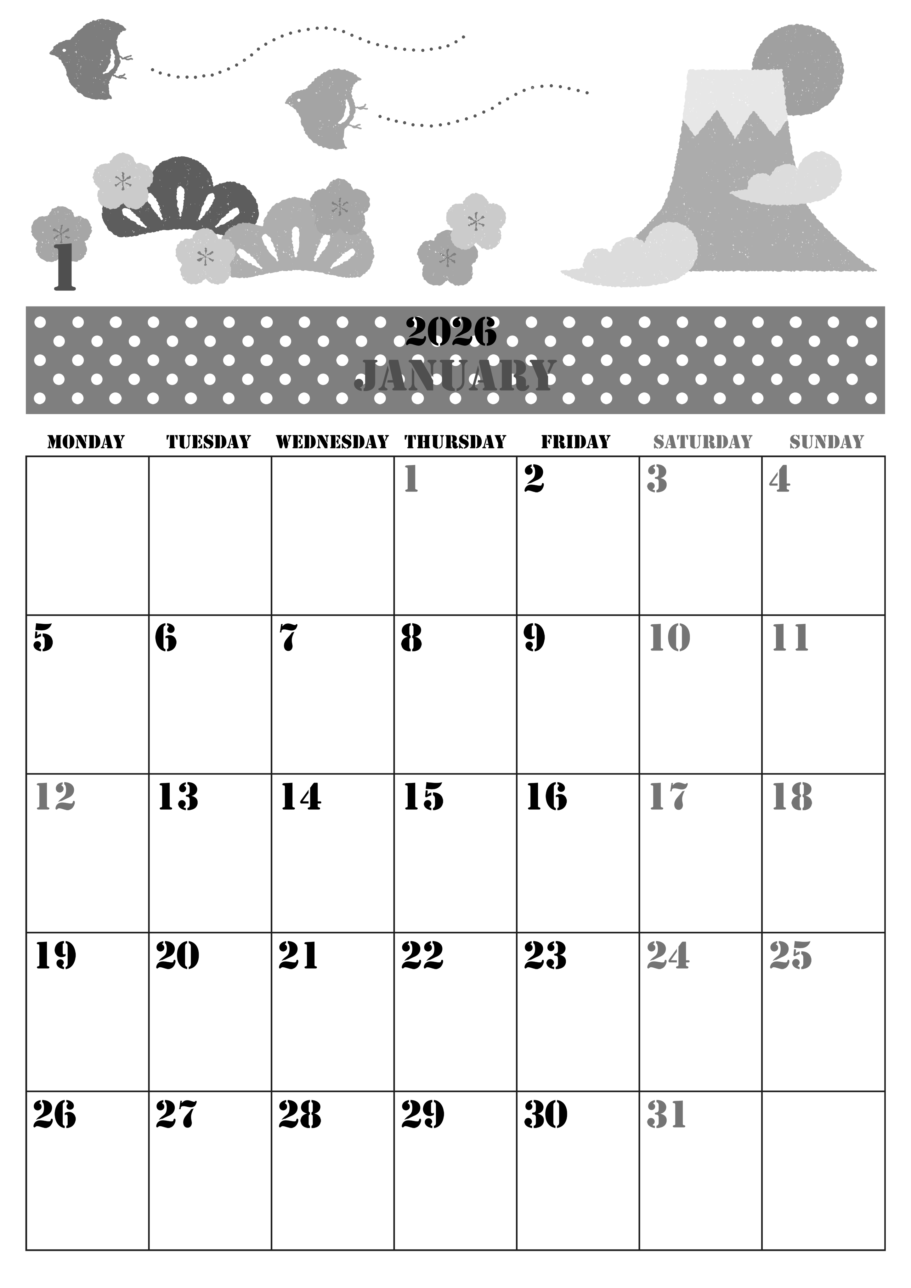 2026年1月縦型モノクロの月曜始まり白黒カレンダーです。白黒カレンダーに便利さを求める人は多いです。それでいてかわいいテイストも欲しいという要望も多々あります。フリー素材でありながらかわいいイラスト部分とスケジュールを書き込みできる箇所のシンプルさのコントラストがはっきりしているのでおすすめです。(2026-00290111)