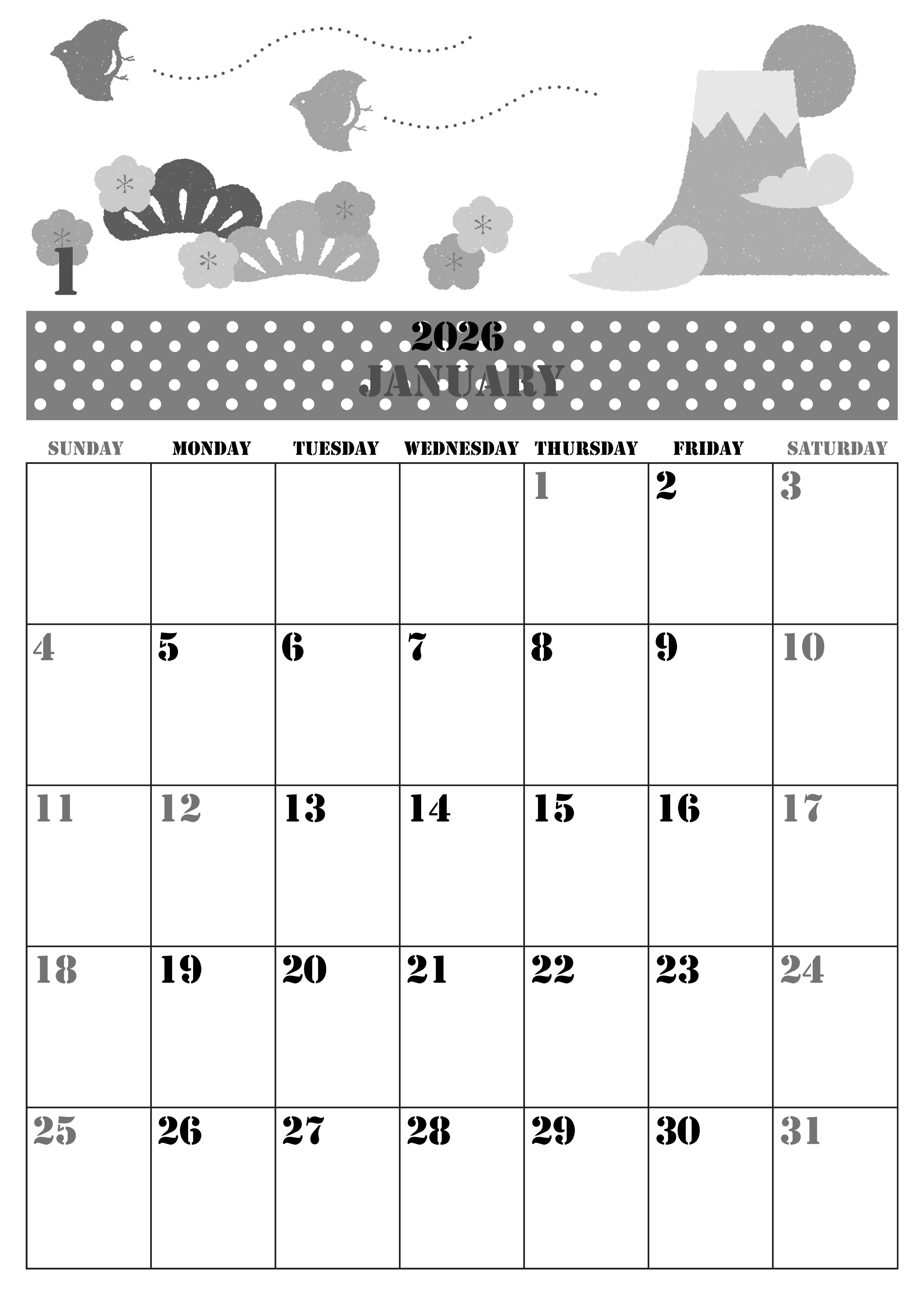 2026年1月縦型モノクロの日曜始まり白黒カレンダーです。A4白紙に印刷をすれば見やすい白黒カレンダーがすぐに用意出来ます。曜日ごとに色分けがされているので見やすい便利なフリー素材です。それだけでなくイラストが和風かわいいテイストなので使っていて楽しくなります。(2026-00290110)