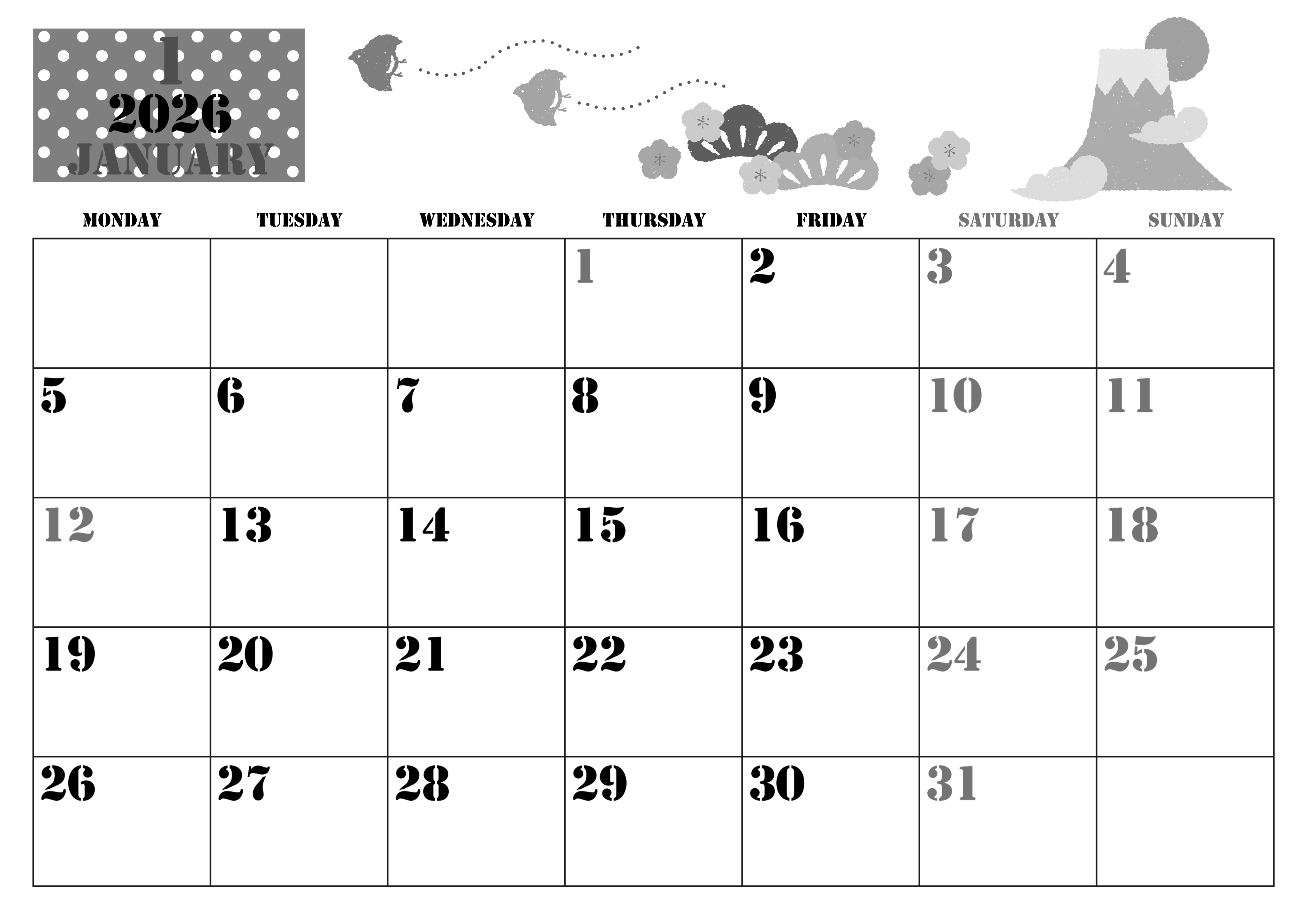 2026年1月横型モノクロの月曜始まり 和風な富士山イラストのかわいいA4無料白黒カレンダー(2026-00290101)
