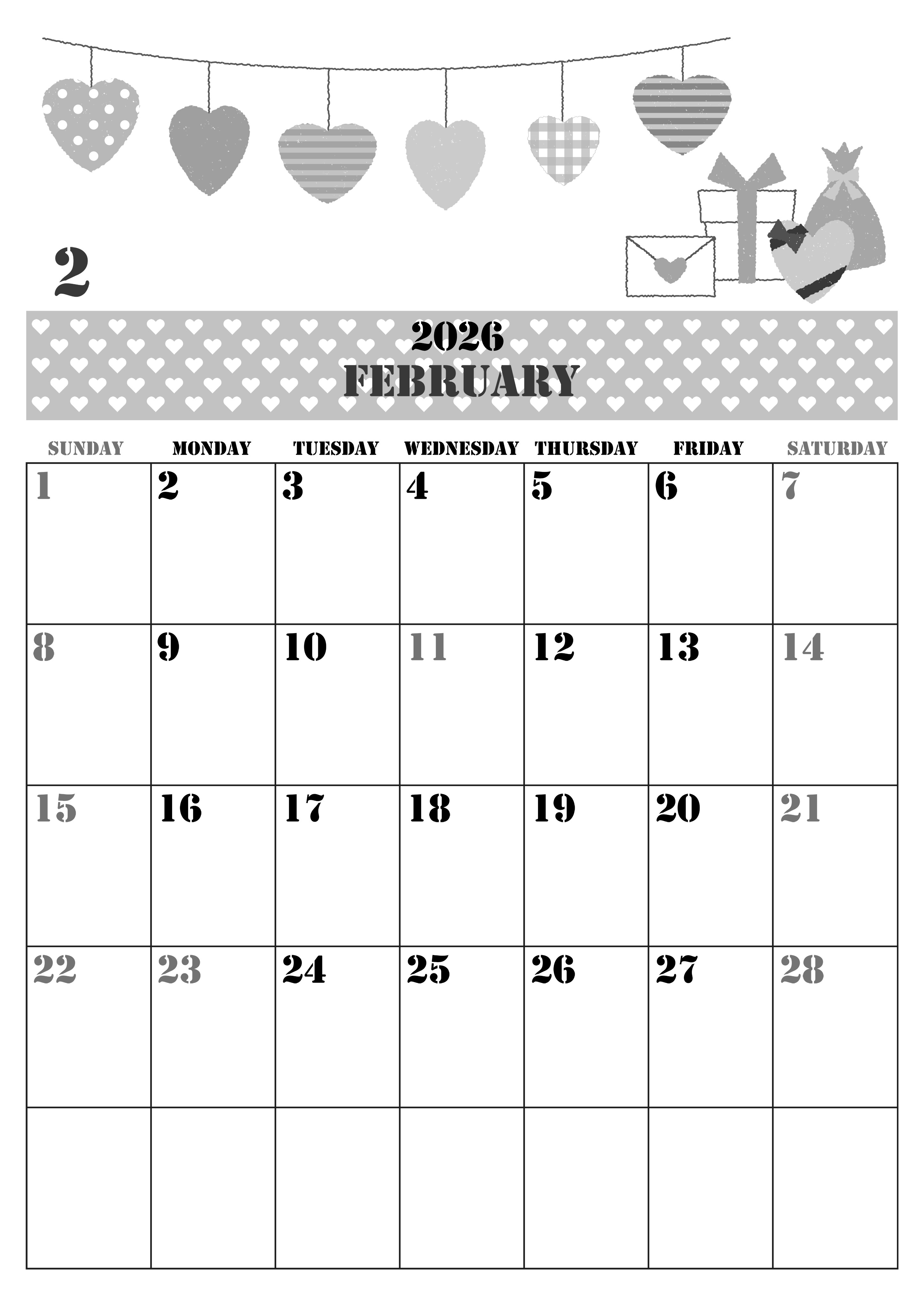 2026年2月縦型モノクロの日曜始まりの無料テンプレート白黒カレンダーです。ハートがいっぱい溢れているバレンタインの要素が詰まった白紙に印刷しても充分かわいい縦型モノクロのフリー素材白黒カレンダーです。(2026-00290210)
