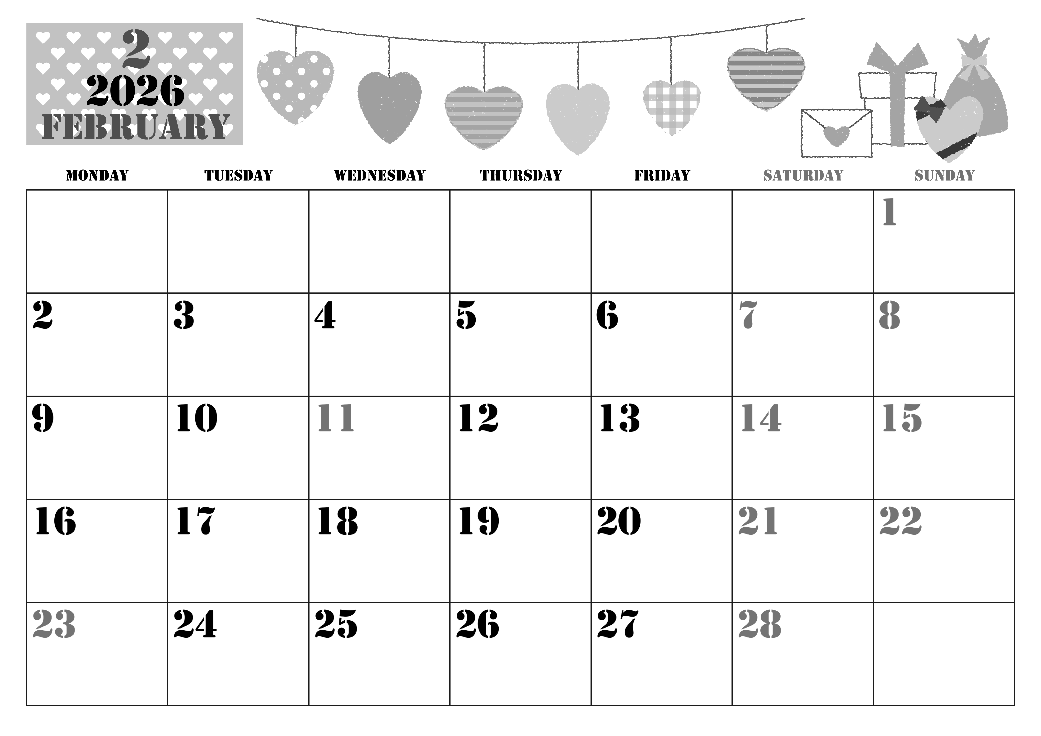 2026年2月横型モノクロの月曜始まりの無料テンプレート白黒カレンダーです。シマシマ、水玉、チェックと様々なデザインのハートがかわいいタスク管理に使いやすい月曜始まりの無料白黒カレンダーです。(2026-00290201)