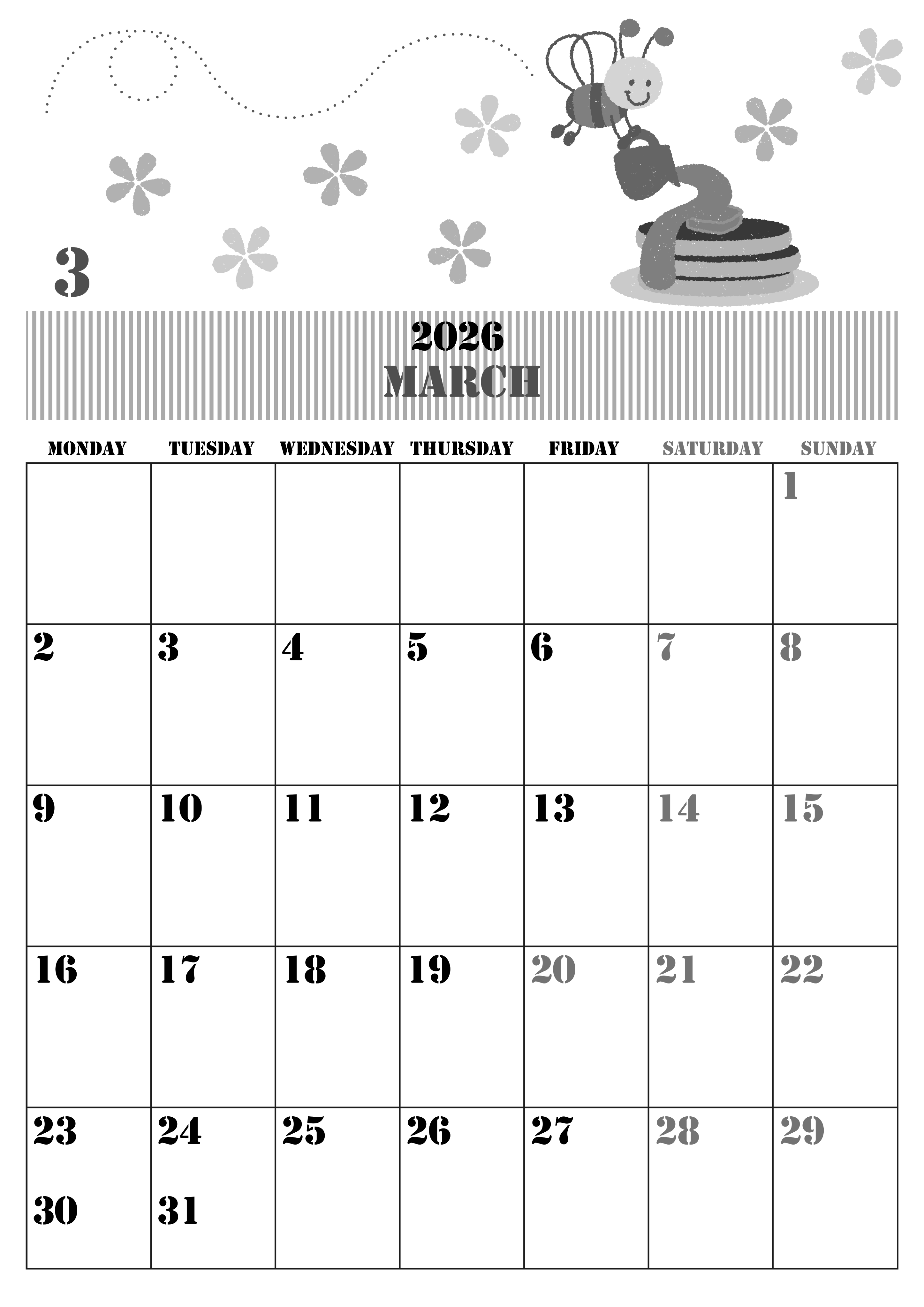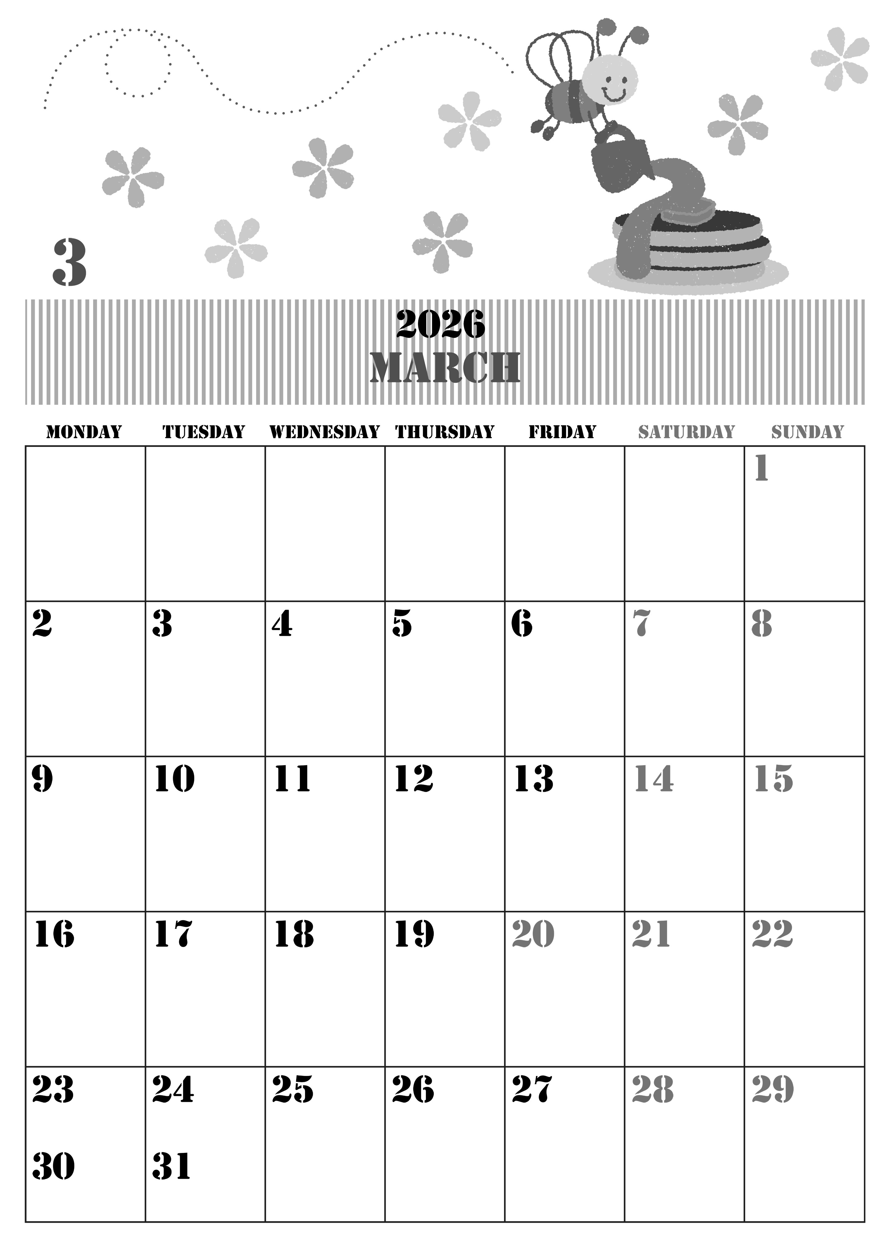 2026年3月縦型モノクロの月曜始まりの無料テンプレート白黒カレンダーです。たっぷりのメープルシロップをミツバチが一生懸命かけているかわいいフリー素材のイラストです。月曜始まり白黒カレンダーなので予定管理に最適です。(2026-00290311)