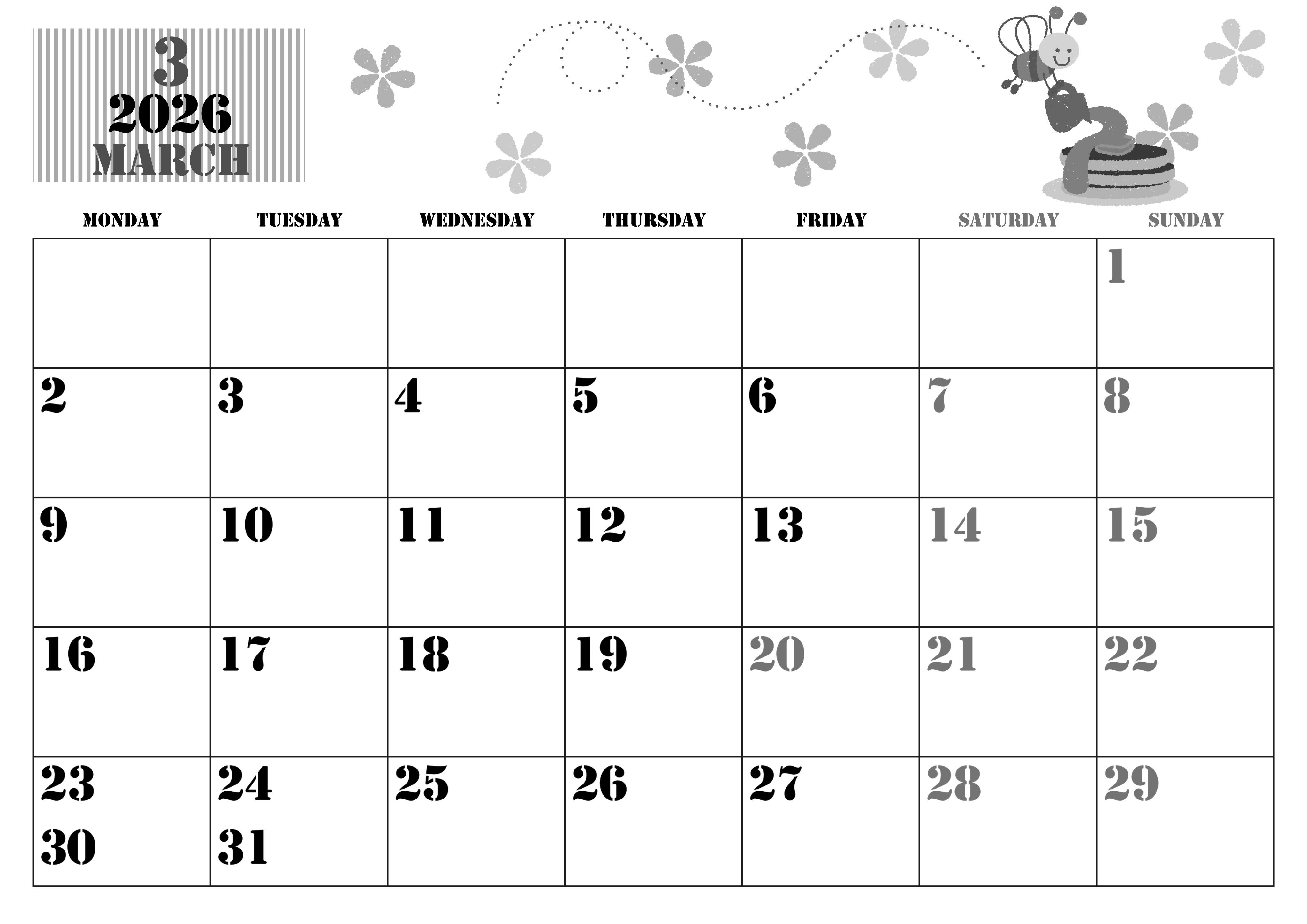 2026年・無料のカレンダーテンプレート 2026年3月横型モノクロの月曜始まり パンケーキイラストのかわいいA4無料白黒カレンダー(2026-00290301) 素材状デザイン王 2025年4月1日 2026年3月横型モノクロの月曜始まりの無料テンプレート白黒カレンダーです。花が散りばめられる中を笑顔のミツバチがパンケーキにトッピングしているかわいいイラストの月曜始まり白黒カレンダーです。(2026-00290301) 3月 横型のカレンダー 月曜始まり 白黒 カレンダーデザイン-0029