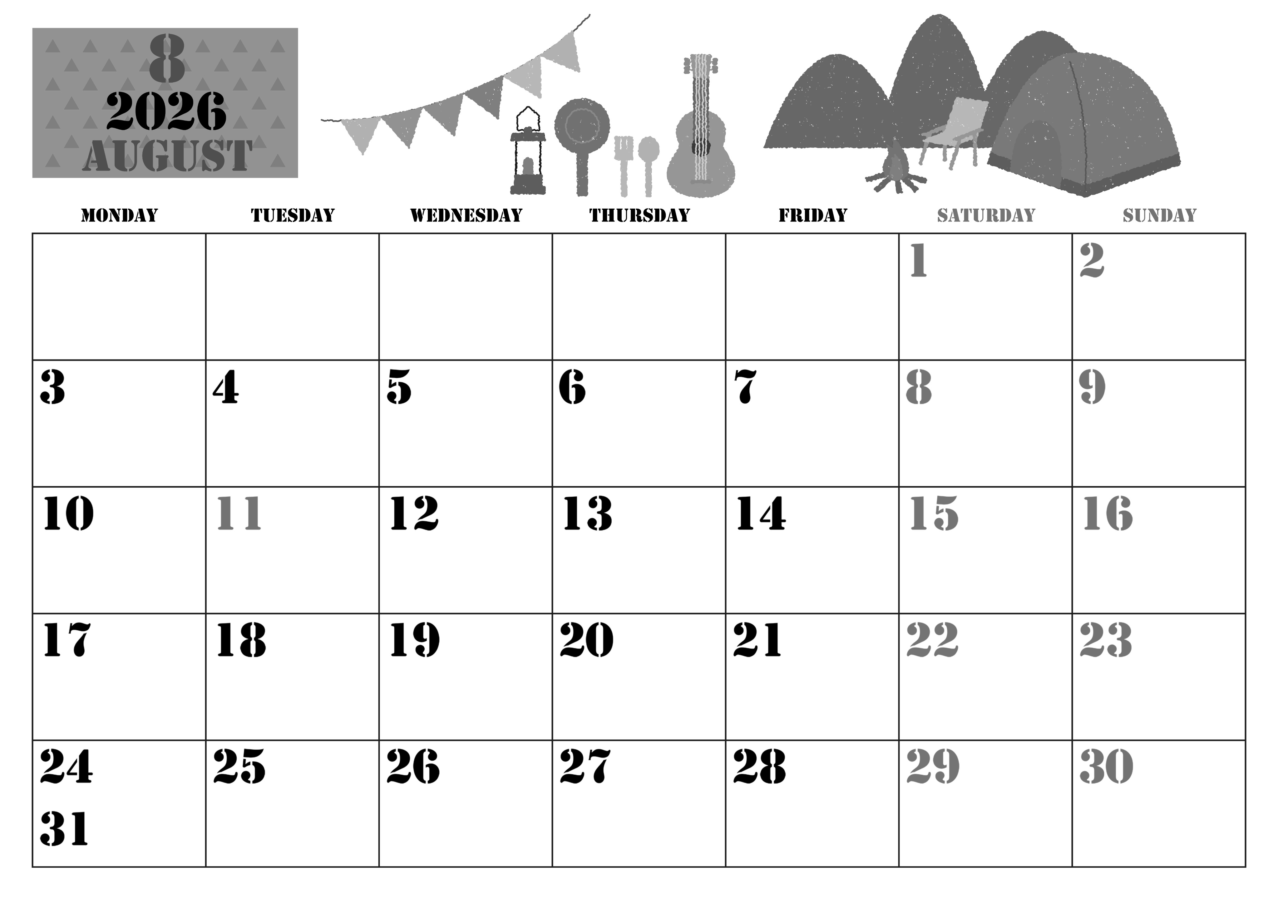 2026年8月横型モノクロの月曜始まりの無料テンプレート白黒カレンダーです。月曜始まり白黒カレンダーを探している人にダウンロードをおすすめしたい夏休みのキャンプをテーマにしたかわいいイラスト付きの白黒カレンダーとなっています。(2026-00290801)