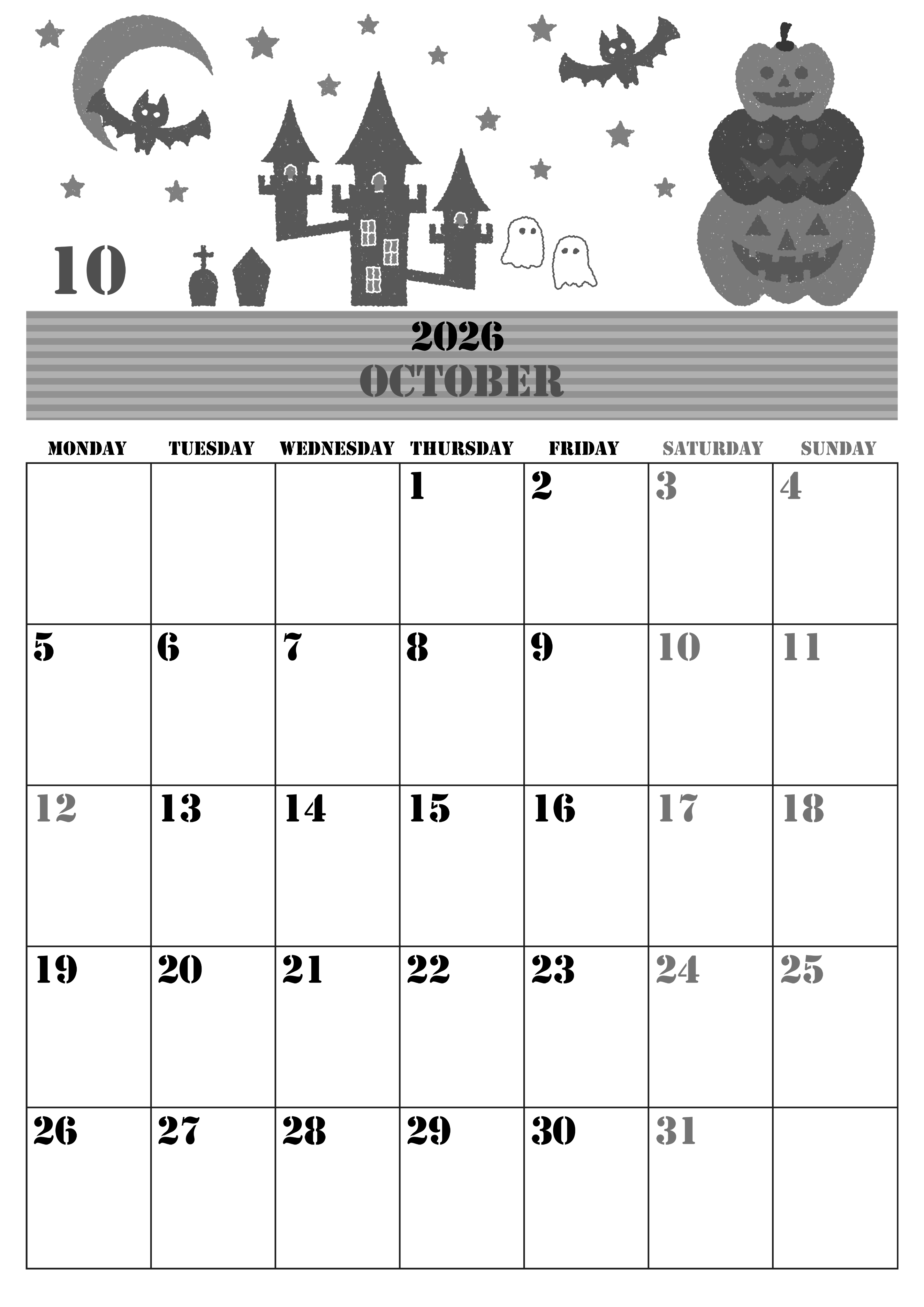 2026年10月縦型モノクロの月曜始まり ハロウィンイラストがかわいいA4無料白黒カレンダー(2026-00291011)