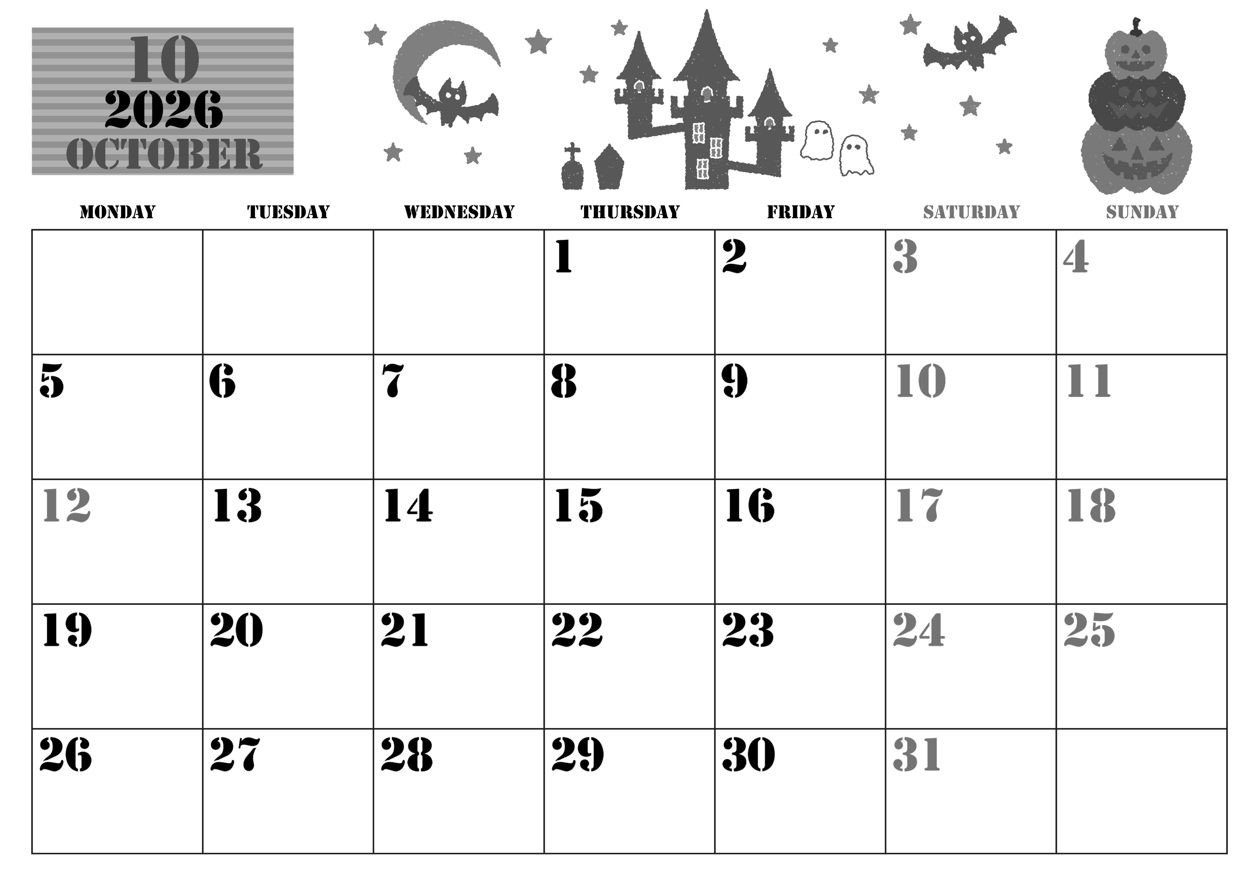 2026年10月横型モノクロの月曜始まりの無料テンプレート白黒カレンダーです。お屋敷の周りにコウモリたちが飛び交っていてハロウィンの世界観がバッチリ描かれているかわいいイラスト白黒カレンダーを用意しました。(2026-00291001)