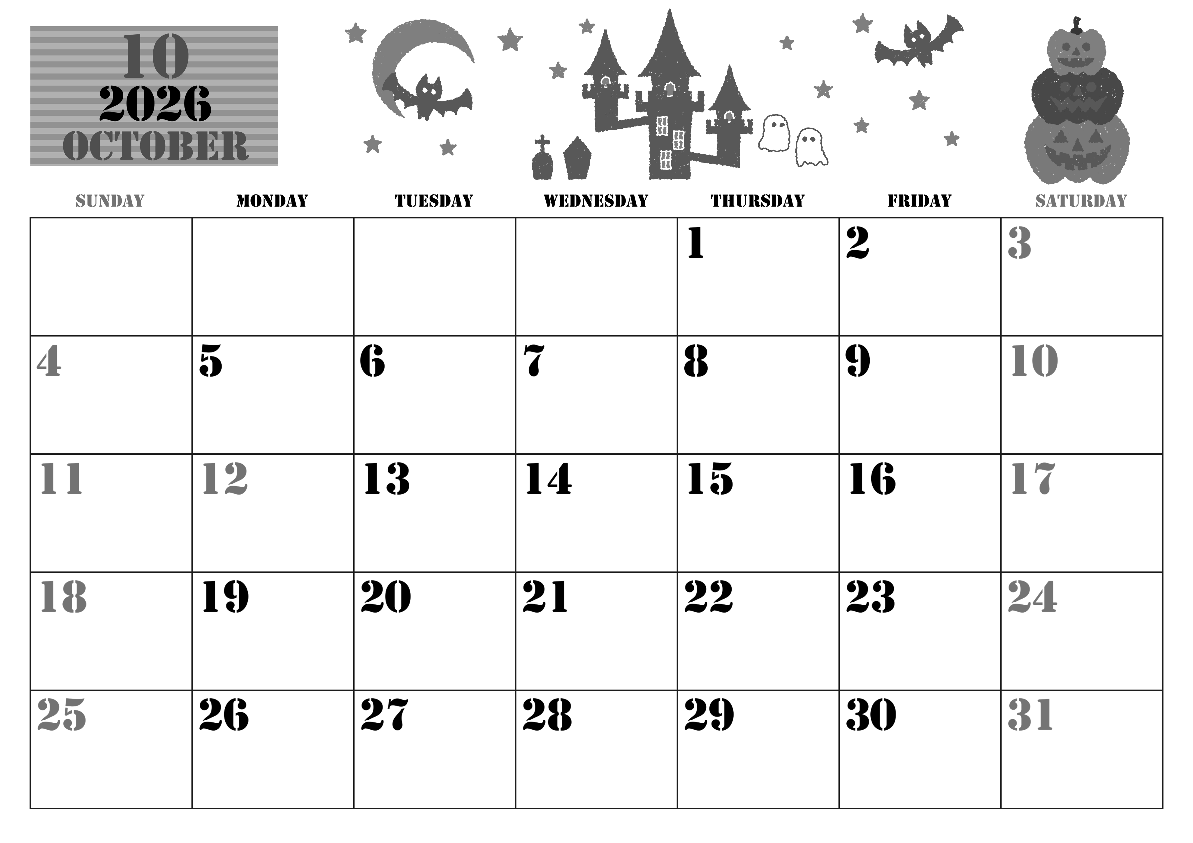 2026年・無料のカレンダーテンプレート 2026年10月横型モノクロの日曜始まり ハロウィンイラストがかわいいA4無料白黒カレンダー(2026-00291000) 素材状デザイン王 2025年4月1日 2026年10月横型モノクロの日曜始まりの無料テンプレート白黒カレンダーです。年月の背景部分がストライプでポップです。イラスト部分もハロウィン要素がたっぷりで非常にかわいいです。(2026-00291000) 10月 横型のカレンダー 日曜始まり 白黒 カレンダーデザイン-0029