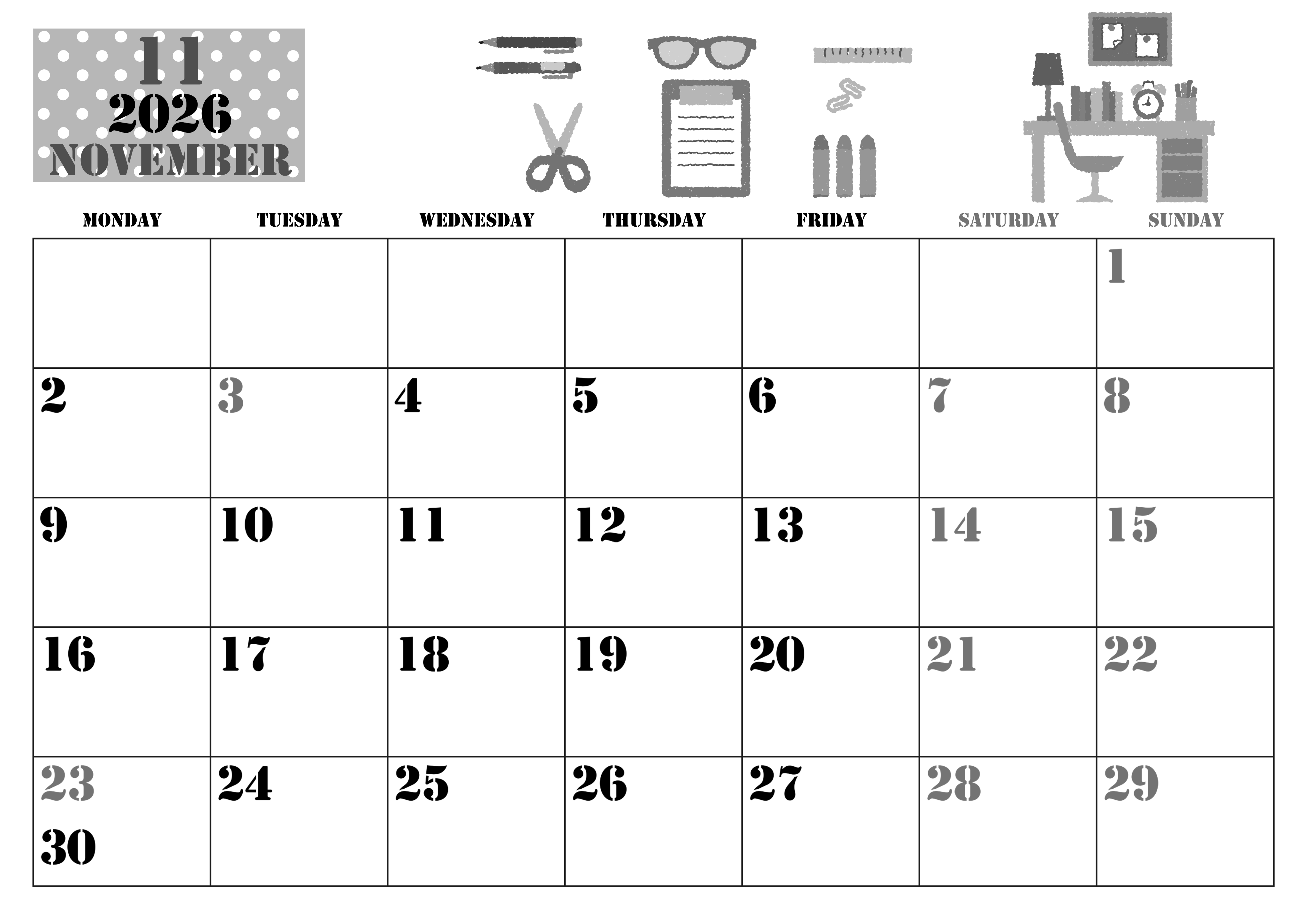 2026年11月横型モノクロの月曜始まりの無料テンプレート白黒カレンダーです。文房具にこだわりを持っているという人におすすめしたいイラストがかわいい白黒カレンダー部分も罫線がはっきりしていて実用的な月曜始まり素材です。(2026-00291101)