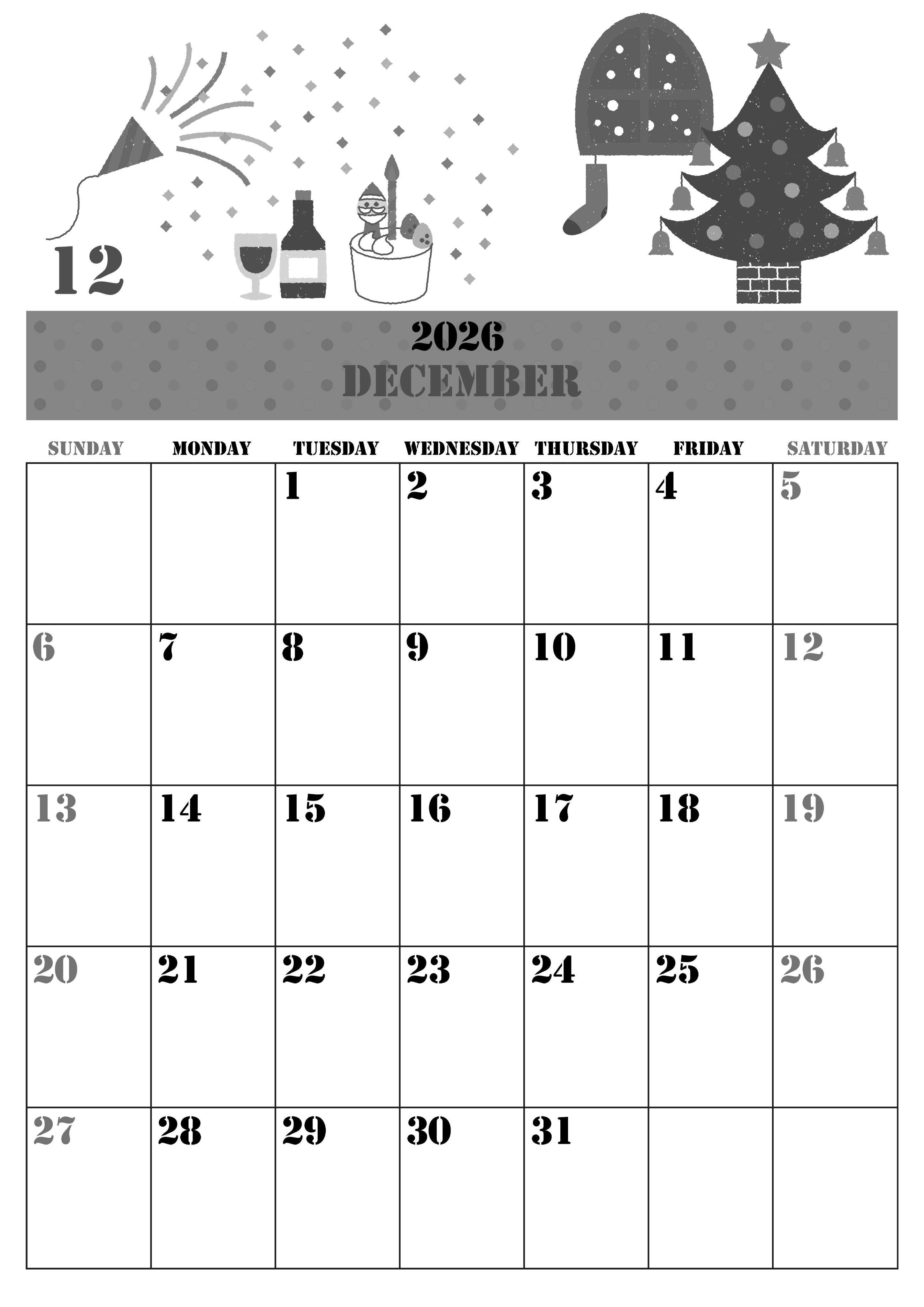 2026年・無料のカレンダーテンプレート 2026年12月縦型モノクロの日曜始まり パーティーのイラストがかわいいA4無料白黒カレンダー(2026-00291210) 素材状デザイン王 2025年4月1日 2026年12月縦型モノクロの日曜始まりの無料テンプレート白黒カレンダーです。クリスマスツリーや靴下やクラッカーやワインといったパーティー要素がたっぷり詰まっているかわいいイラストとなっています。(2026-00291210) 12月 縦型のカレンダー 日曜始まり 白黒 カレンダーデザイン-0029