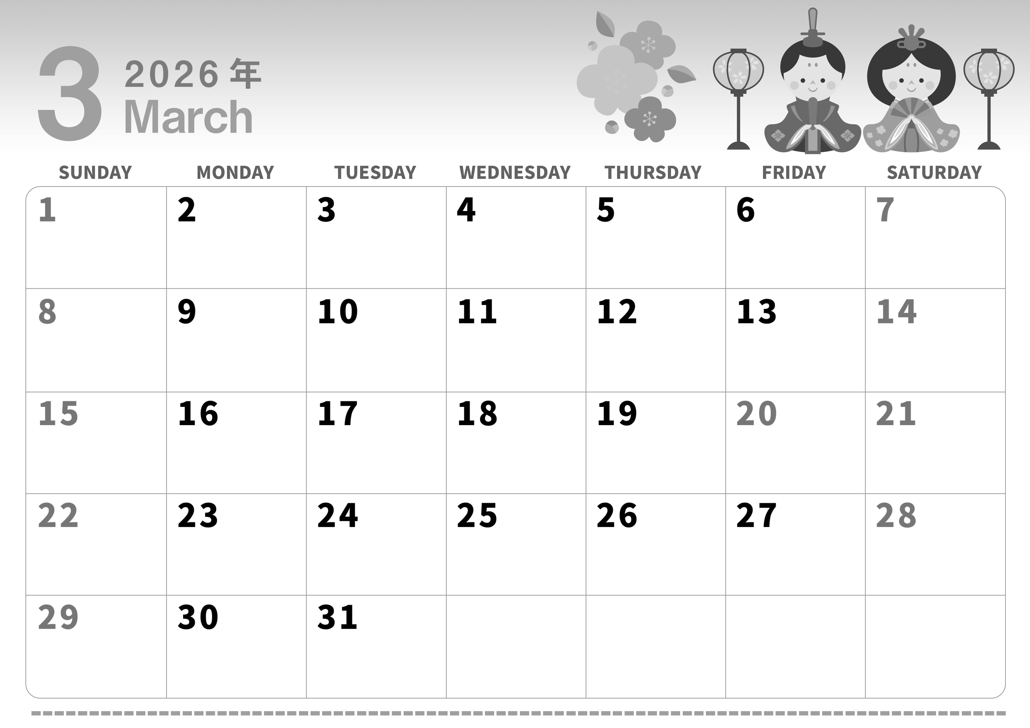 2026年3月横型モノクロの日曜始まり お雛様イラストのかわいいA4無料白黒カレンダー(2026-00300300)