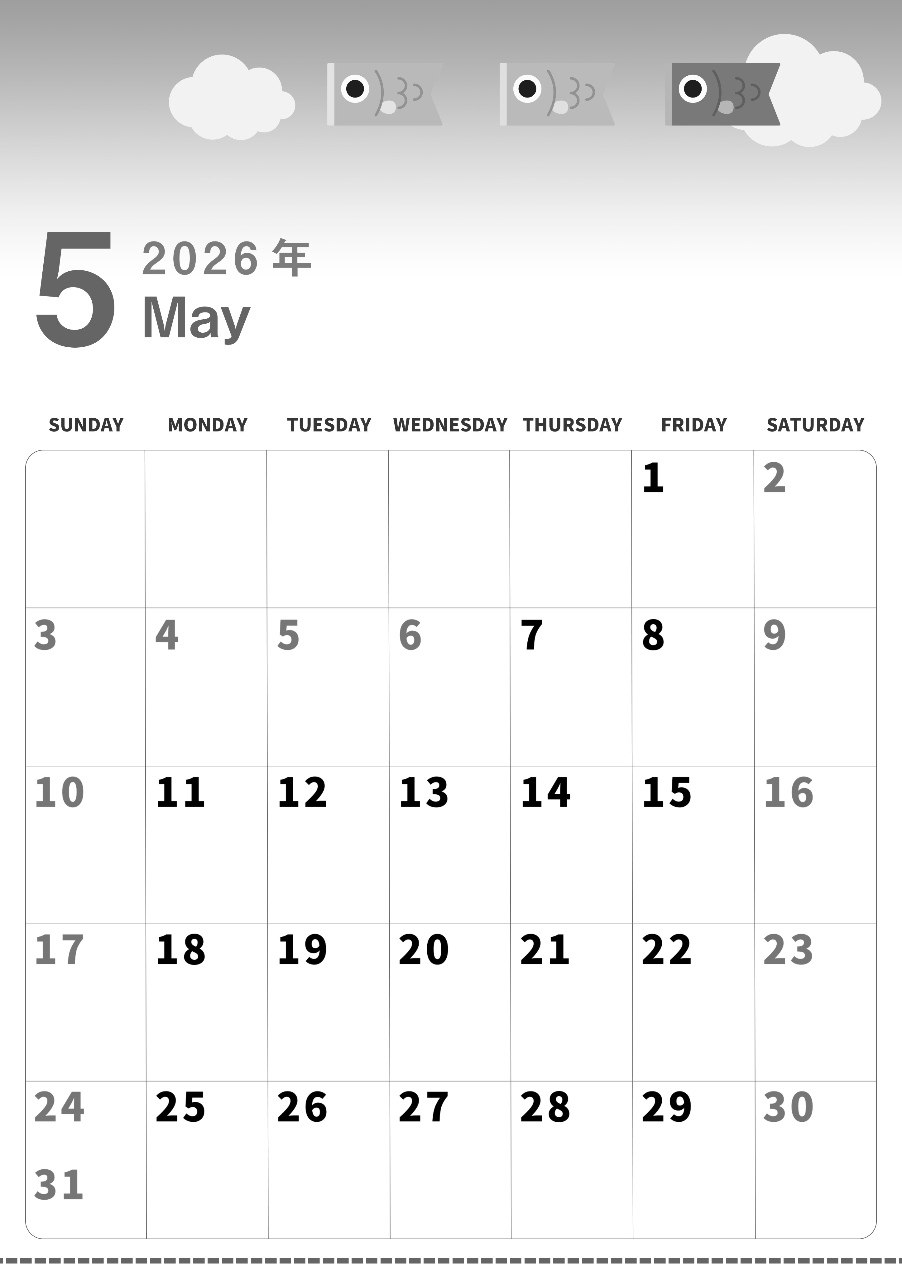 2026年5月縦型モノクロの日曜始まりの無料テンプレート白黒カレンダーです。罫線がくっきりしていてスケジュールを見やすいデザインの白黒カレンダーです。赤青黄の鯉のぼりトリオのイラスもかわいいので使うのが楽しいです。(2026-00300510)