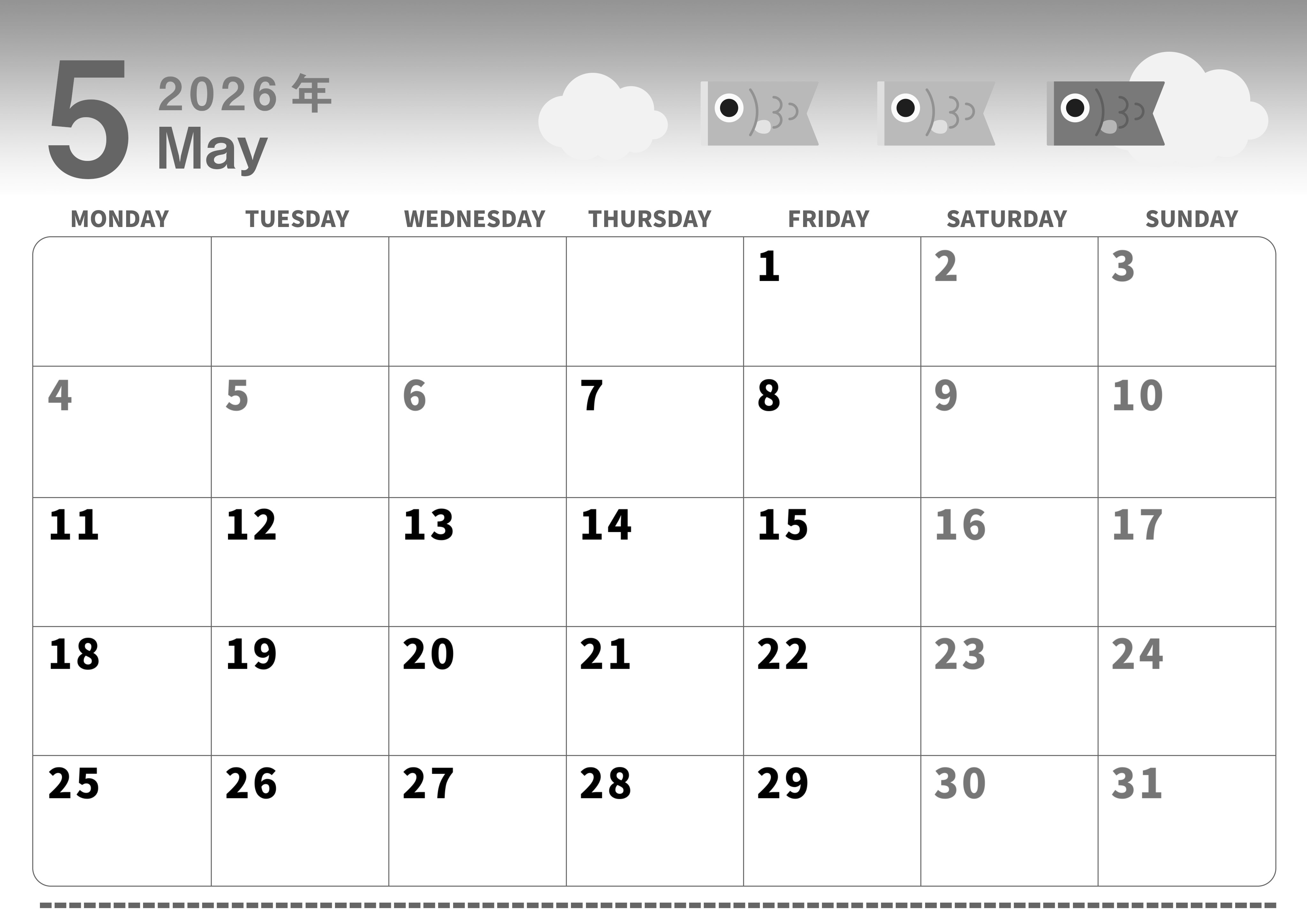 2026年・無料のカレンダーテンプレート 2026年5月横型モノクロの月曜始まり 鯉のぼりイラストのかわいいA4無料白黒カレンダー(2026-00300501) 素材状デザイン王 2025年4月1日 2026年5月横型モノクロの月曜始まりの無料テンプレート白黒カレンダーです。3匹の鯉のぼりのイラストがかわいい白黒カレンダーです。月曜始まりでA4用紙に印刷用の書き込みに適しているフリー素材です。(2026-00300501) 5月 横型のカレンダー 月曜始まり 白黒 カレンダーデザイン-0030