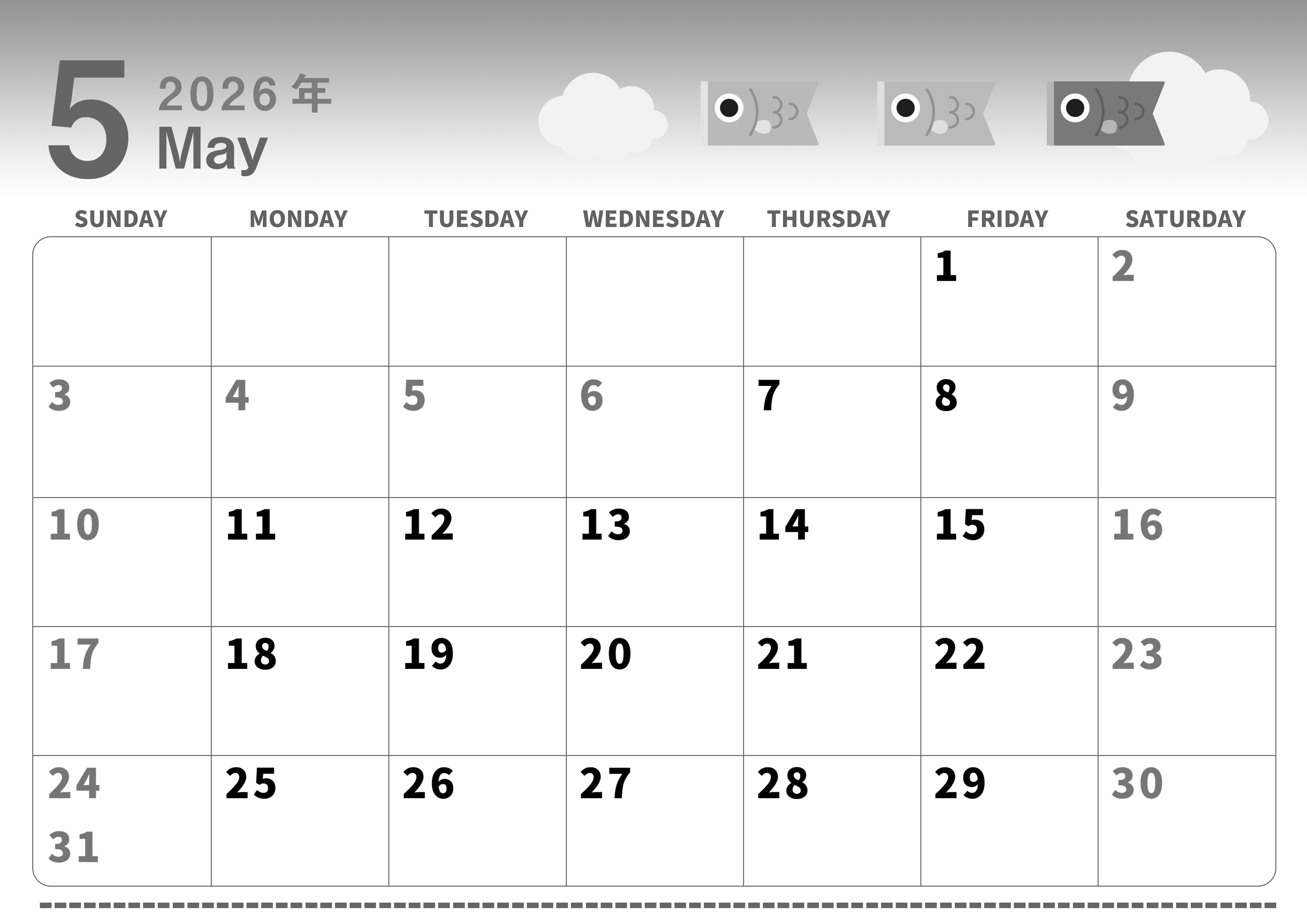 2026年5月横型モノクロの日曜始まりの無料テンプレート白黒カレンダーです。ふわふわと雲の合間を鯉のぼりが泳いでいるかわいいイラストが鮮やかなフリー素材です。白黒カレンダー部分は予定をたっぷり書き込みできるフォーマットです。(2026-00300500)