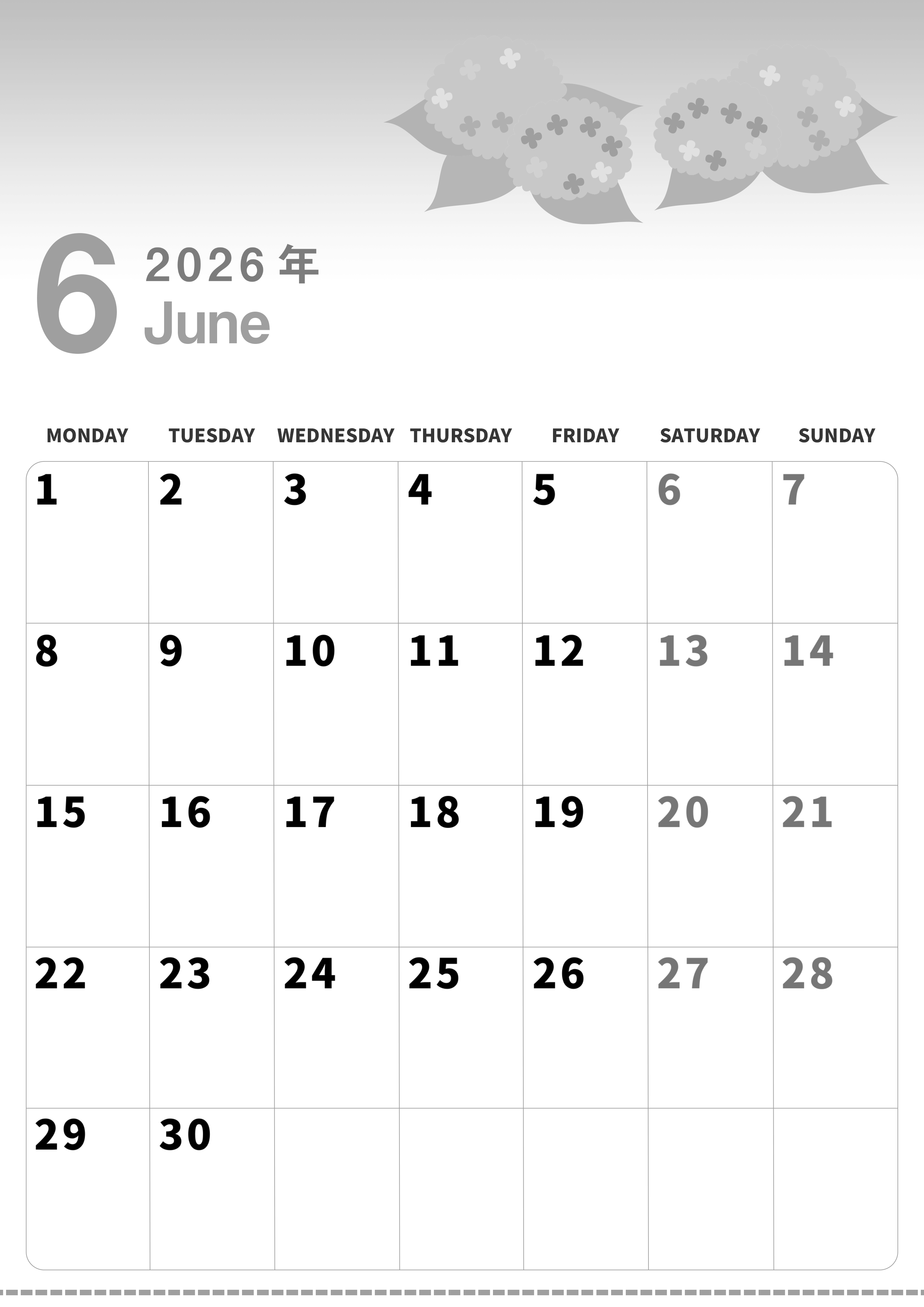 2026年6月縦型モノクロの月曜始まりの無料テンプレート白黒カレンダーです。月曜始まり白黒カレンダーが好きな人におすすめの無料テンプレートです。紫陽花のイラストがワンポイントでかわいいコンテンツです。(2026-00300611)