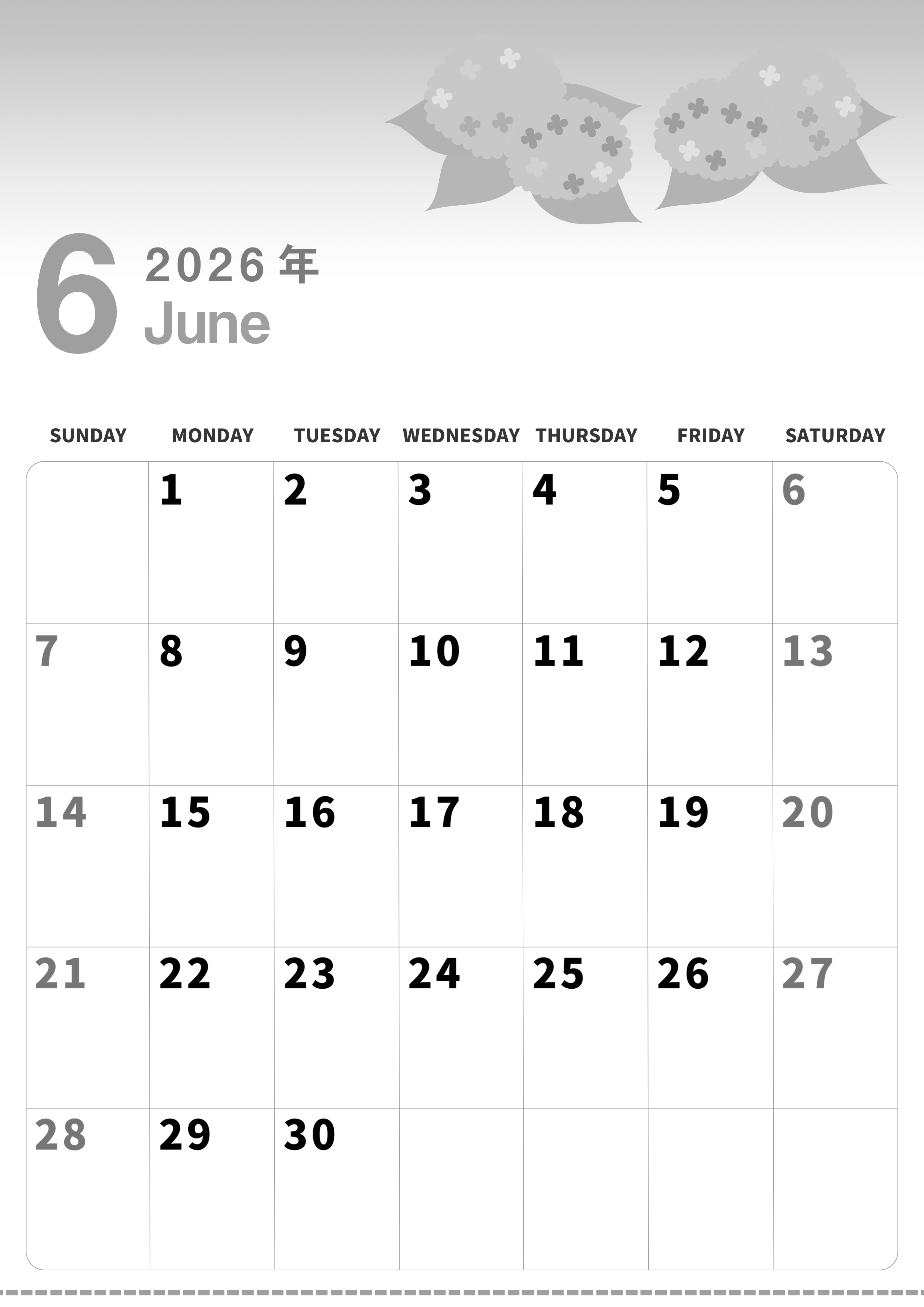 2026年6月縦型モノクロの日曜始まりの無料テンプレート白黒カレンダーです。梅雨を思わせる紫陽花のイラストが季節感がただよっていてかわいいです。ボタニカルな感じもある白黒カレンダーは無料で使えます。(2026-00300610)