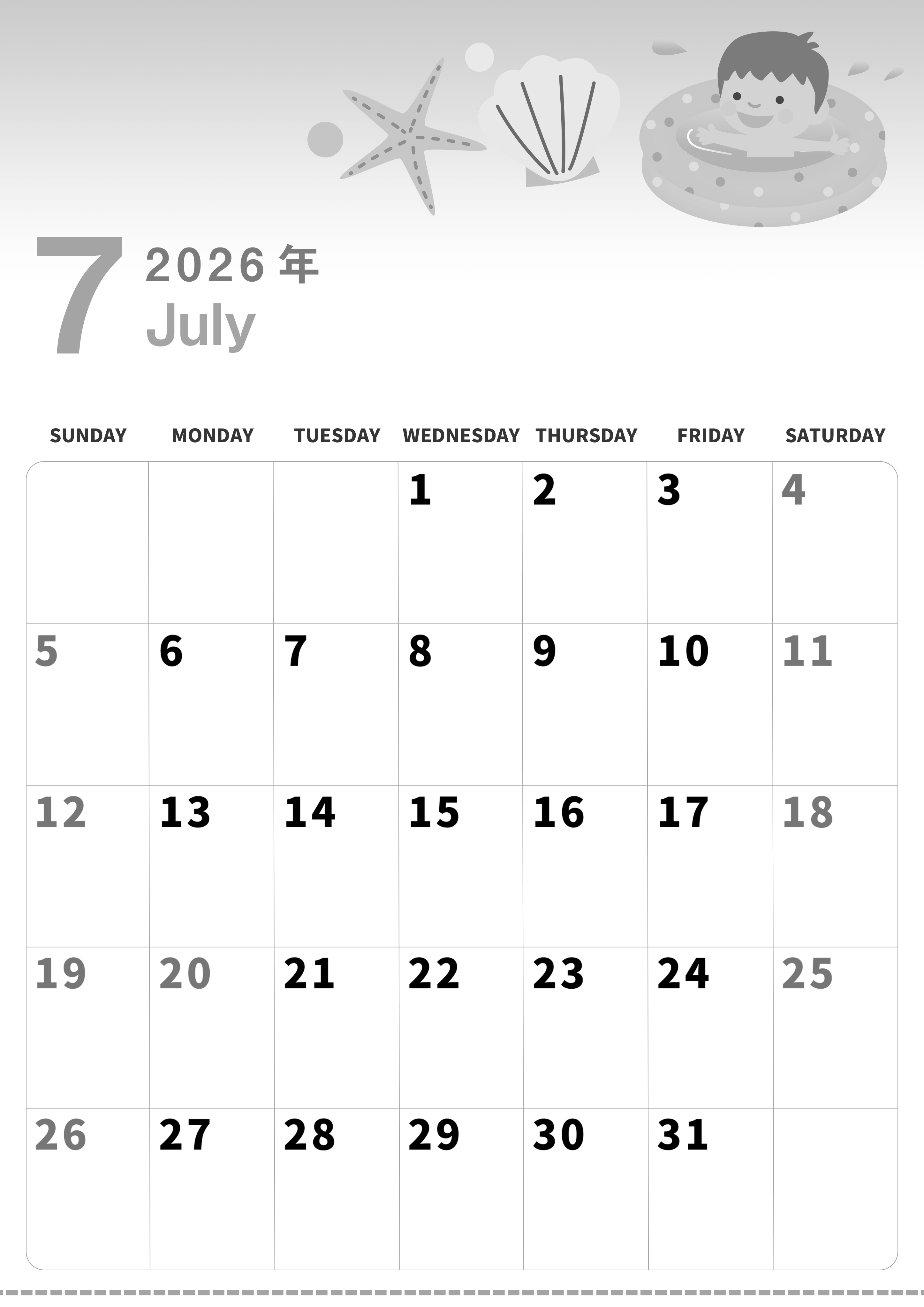 2026年7月縦型モノクロの日曜始まりの無料テンプレート白黒カレンダーです。縦型なのでプリントアウトをして壁に貼って使うのにちょうどいいサイズ感の白黒カレンダーです。海をテーマにしているイラストもかわいいです。(2026-00300710)