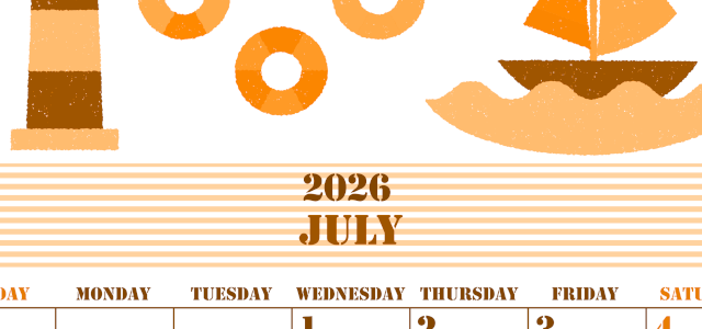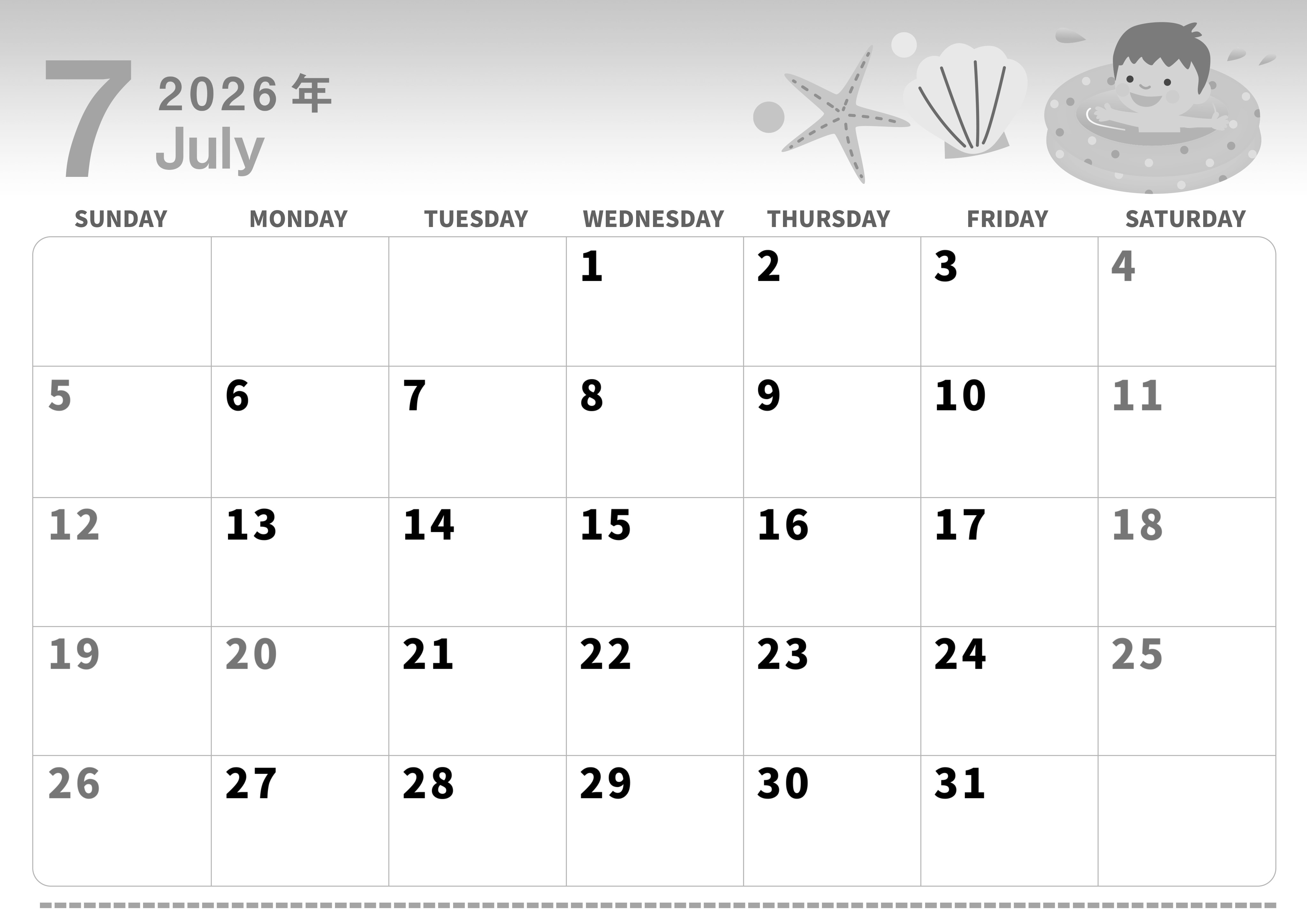 2026年7月横型モノクロの日曜始まり 海のイラストのかわいいA4無料白黒カレンダー(2026-00300700)