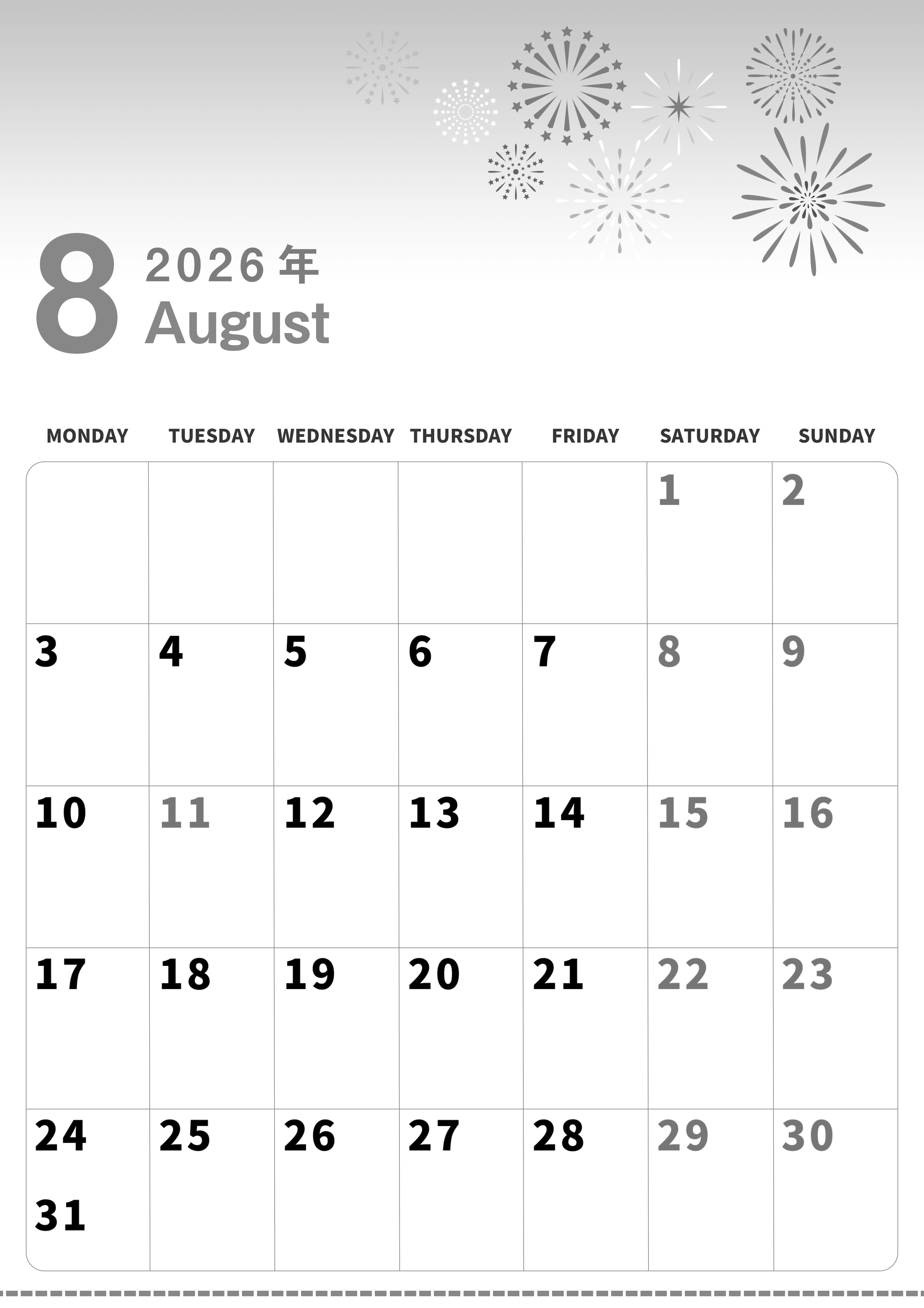2026年8月縦型モノクロの月曜始まりの無料テンプレート白黒カレンダーです。月曜始まりでイラスト全体が澄んでいる青空を連想させるような打ち上げ花火のかわいい白黒カレンダーです。罫線もシンプルで全体的にスタンダードなフォーマットです。(2026-00300811)