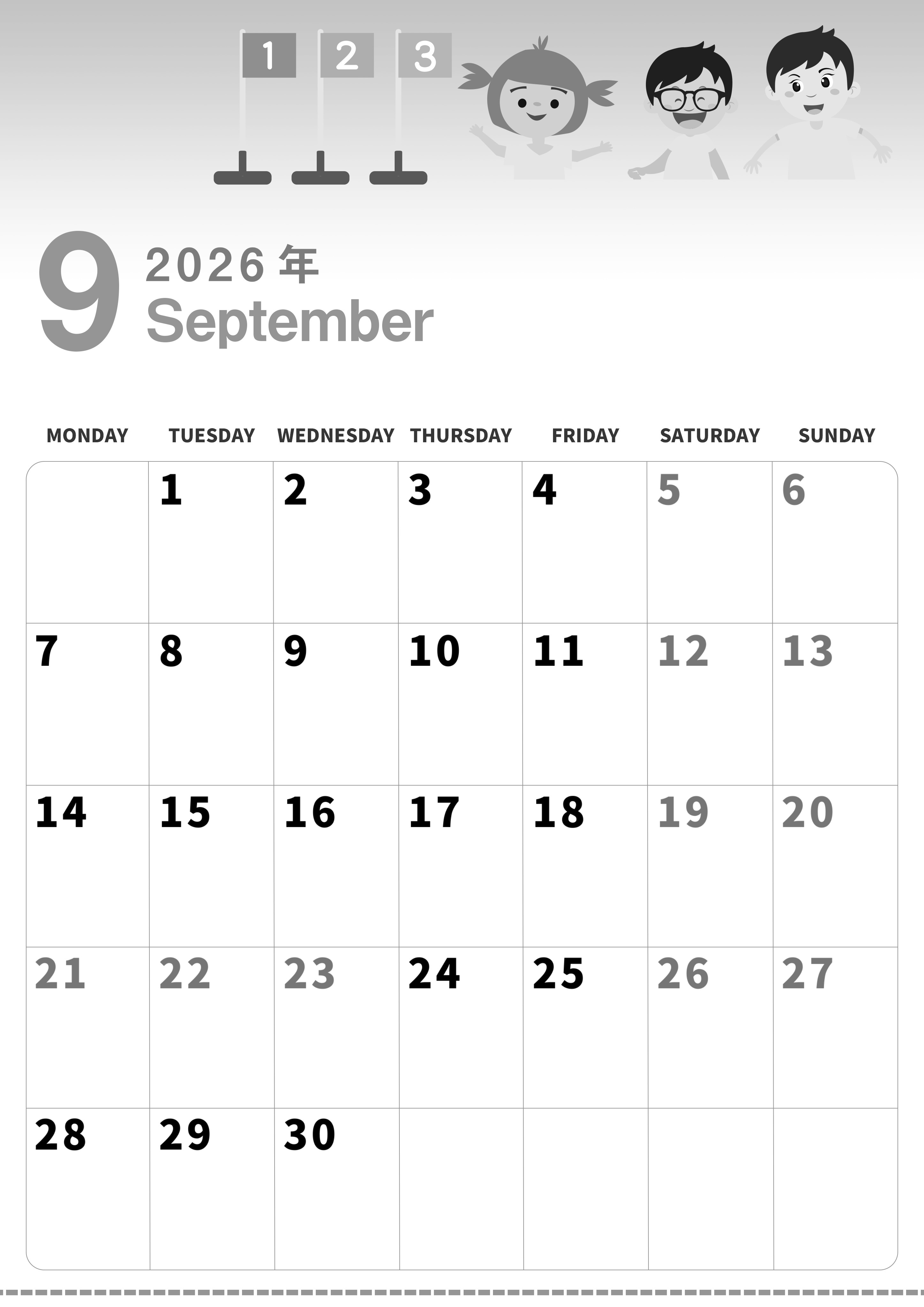 2026年・無料のカレンダーテンプレート 2026年9月縦型モノクロの月曜始まり 運動会イラストのかわいいA4無料白黒カレンダー(2026-00300911) 素材状デザイン王 2025年4月1日 2026年9月縦型モノクロの月曜始まりの無料テンプレート白黒カレンダーです。運動会の様子をグラデーションの背景にシンプルに描いたかわいいイラスト素材となっています。月曜始まりで使いやすいです。(2026-00300911) 9月 縦型のカレンダー 月曜始まり 白黒 カレンダーデザイン-0030