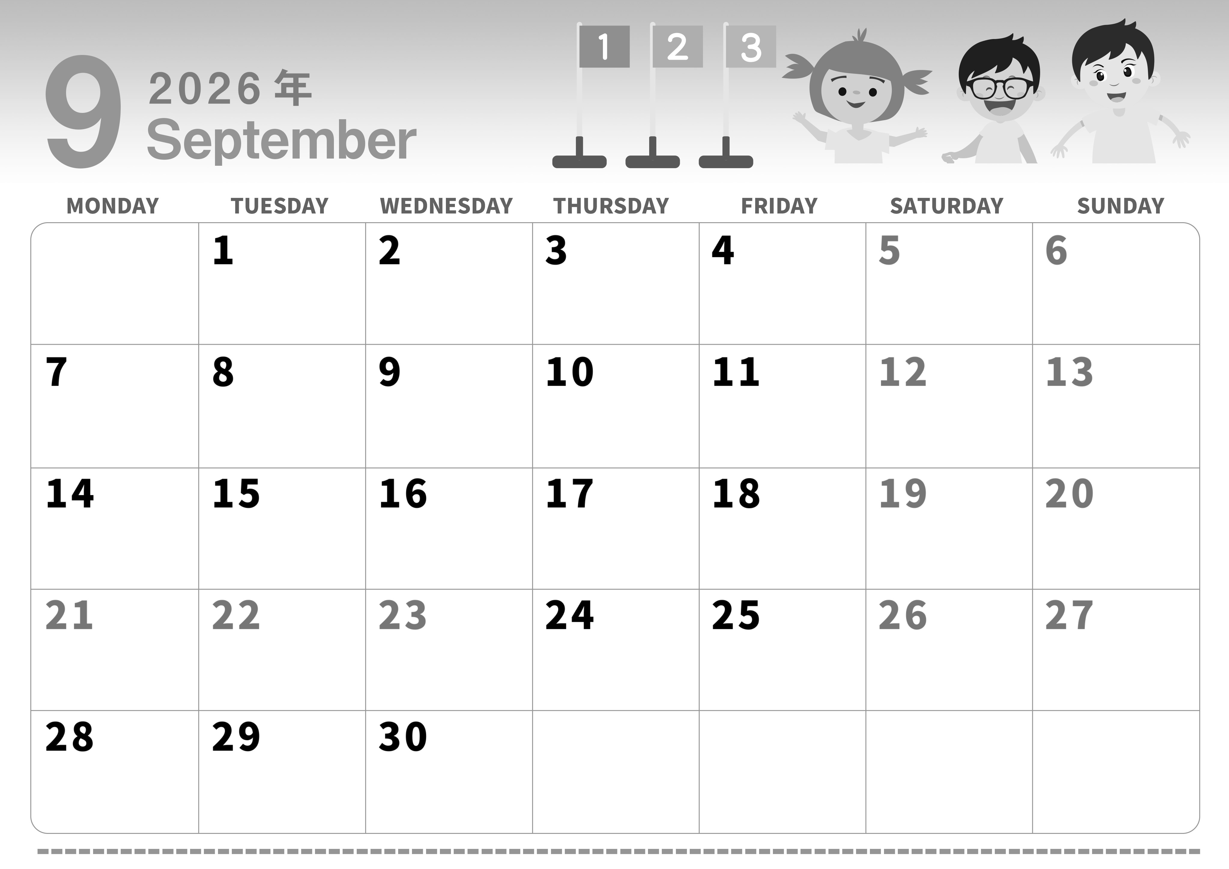 2026年9月横型モノクロの月曜始まりの無料テンプレート白黒カレンダーです。秋のイベントのひとつでもある運動会を題材にしたイラストがかわいいです。月曜始まりで仕事や勉強のプランニングに適しています。(2026-00300901)