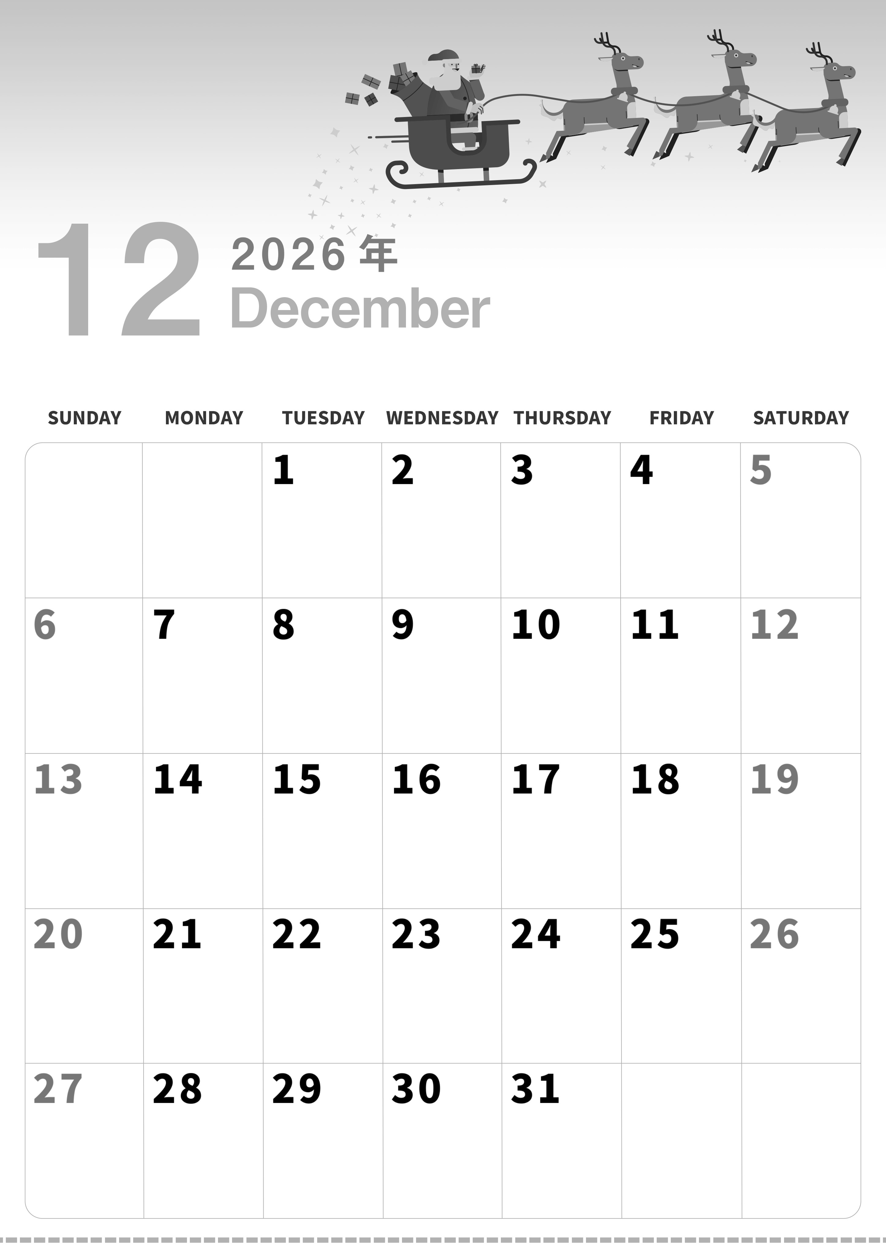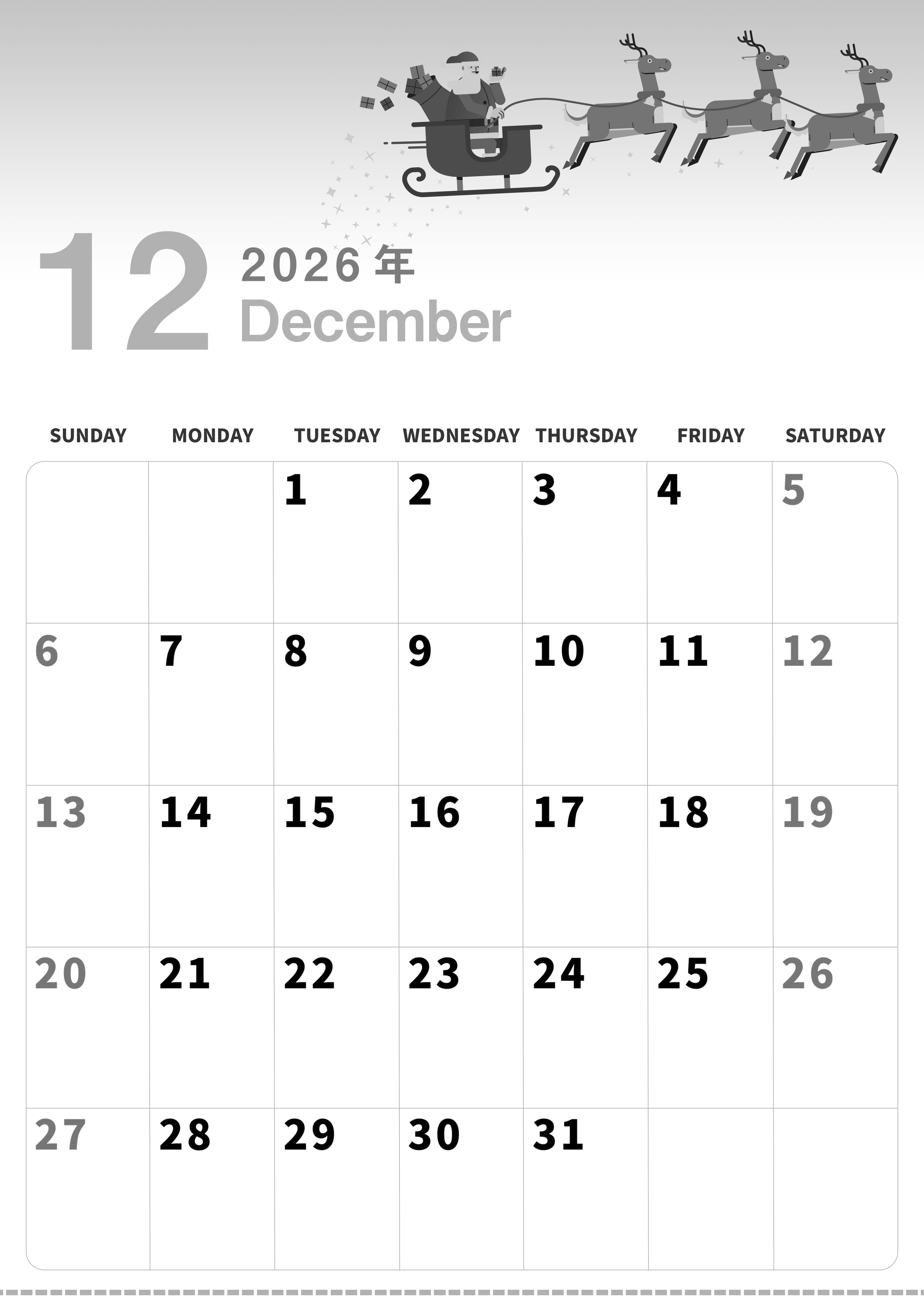 2026年12月縦型モノクロの日曜始まり トナカイのイラストがかわいいA4無料白黒カレンダー(2026-00301210)