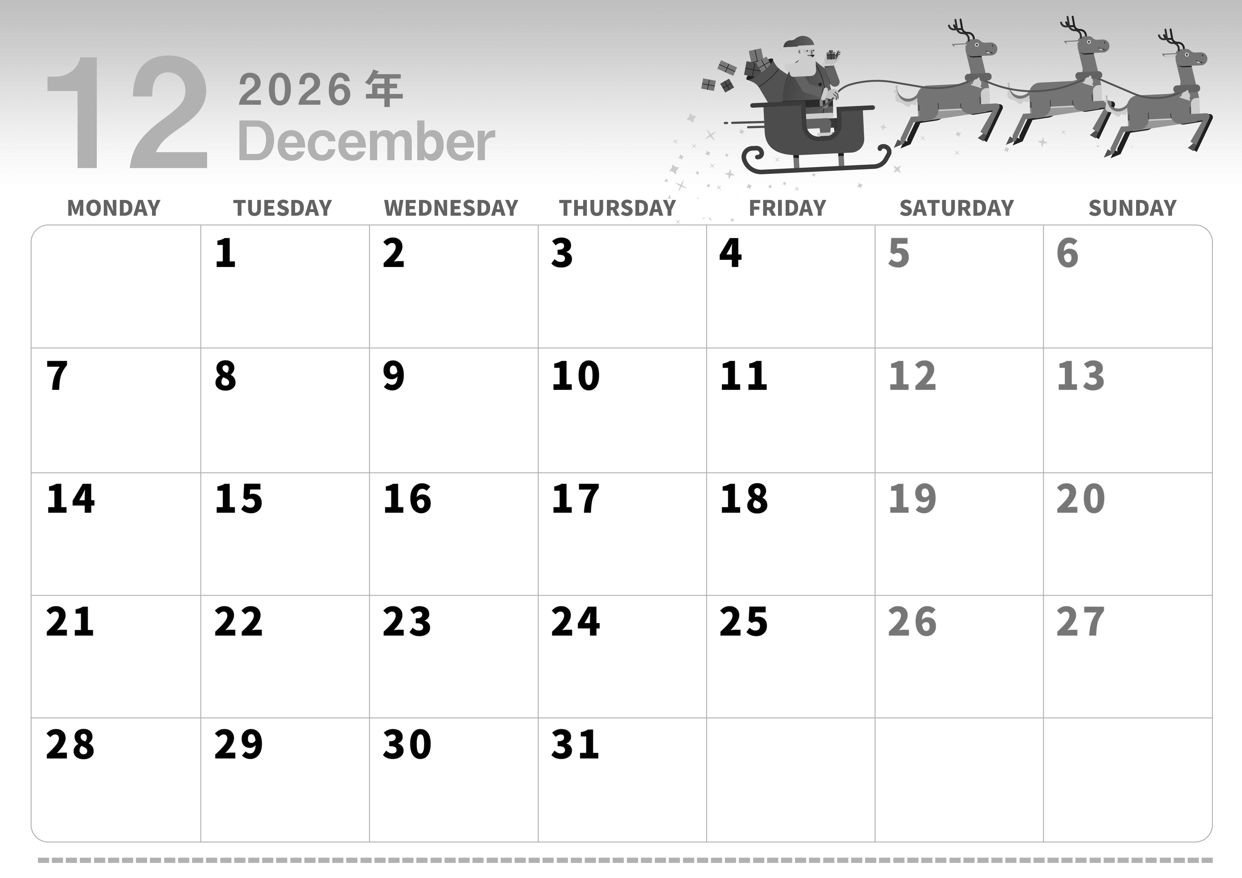 2026年12月横型モノクロの月曜始まりの無料テンプレート白黒カレンダーです。トナカイたちが一生懸命空を駆け巡っている様子をテーマにしているイラストがクリスマスの高揚感を表現していてとてもかわいい仕上がりとなっています。(2026-00301201)