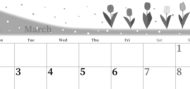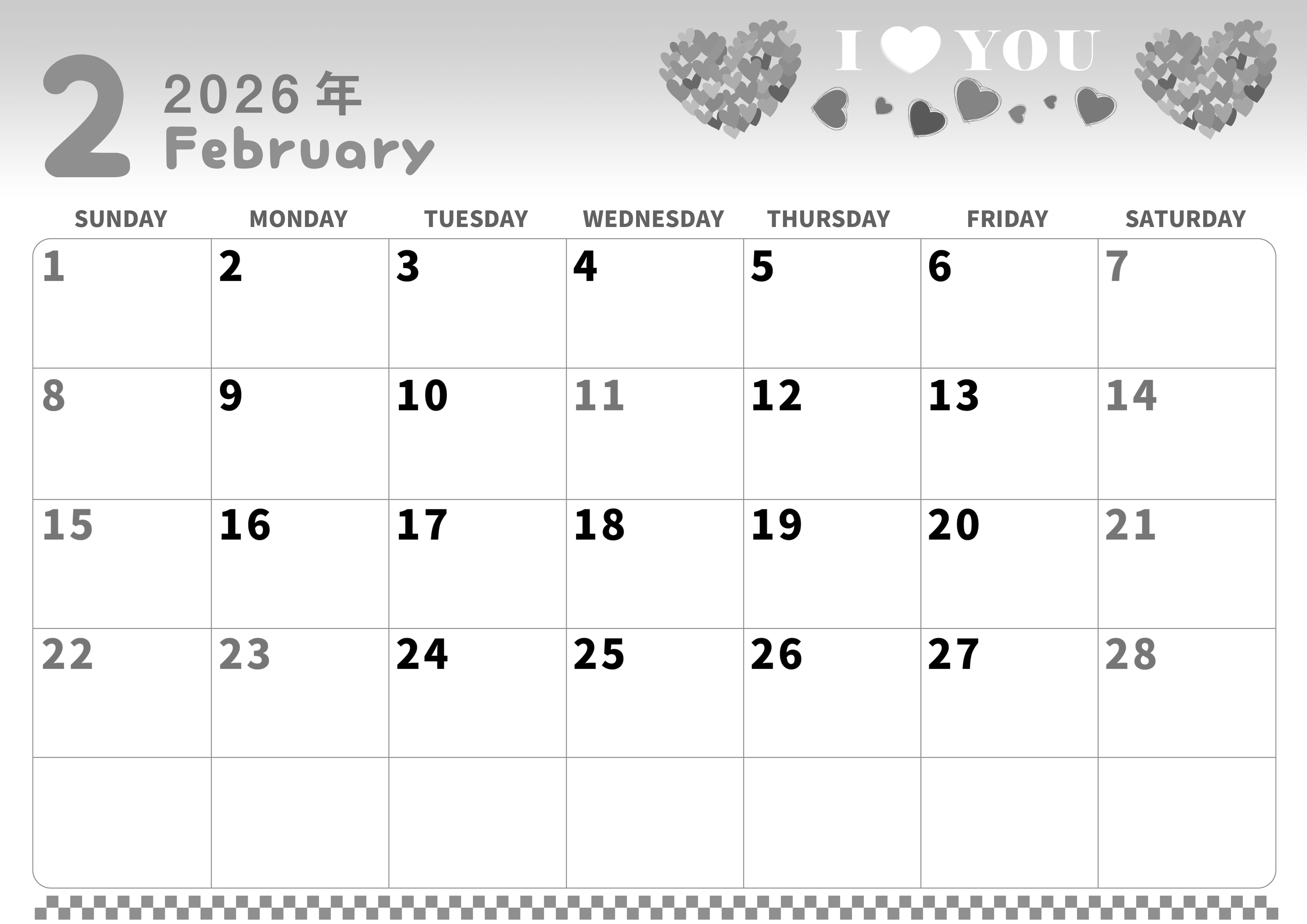 2026年2月横型モノクロの日曜始まりの無料テンプレート白黒カレンダーです。たっぷりの小さなハートが集まって大きなひとつのハートができあがっているガーリーかつおしゃれ心のあるかわいいイラスト白黒カレンダーです。(2026-00310200)