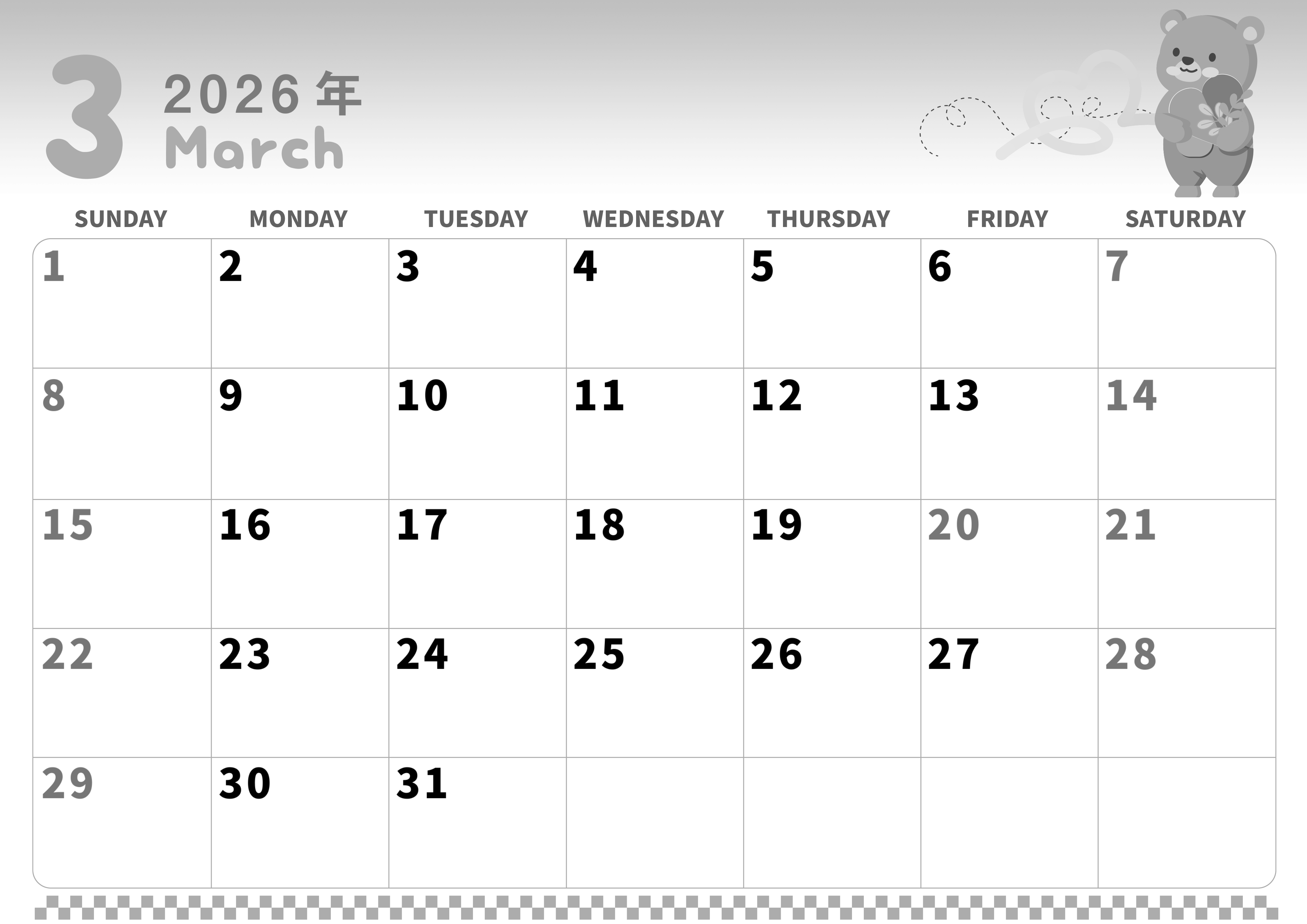 2026年3月横型モノクロの日曜始まりの無料テンプレート白黒カレンダーです。グラデーションが気分を爽快にしてしてくれるような透き通る見栄えの白黒カレンダー素材です。クマのぬいぐるみのイラストもかわいいです。(2026-00310300)