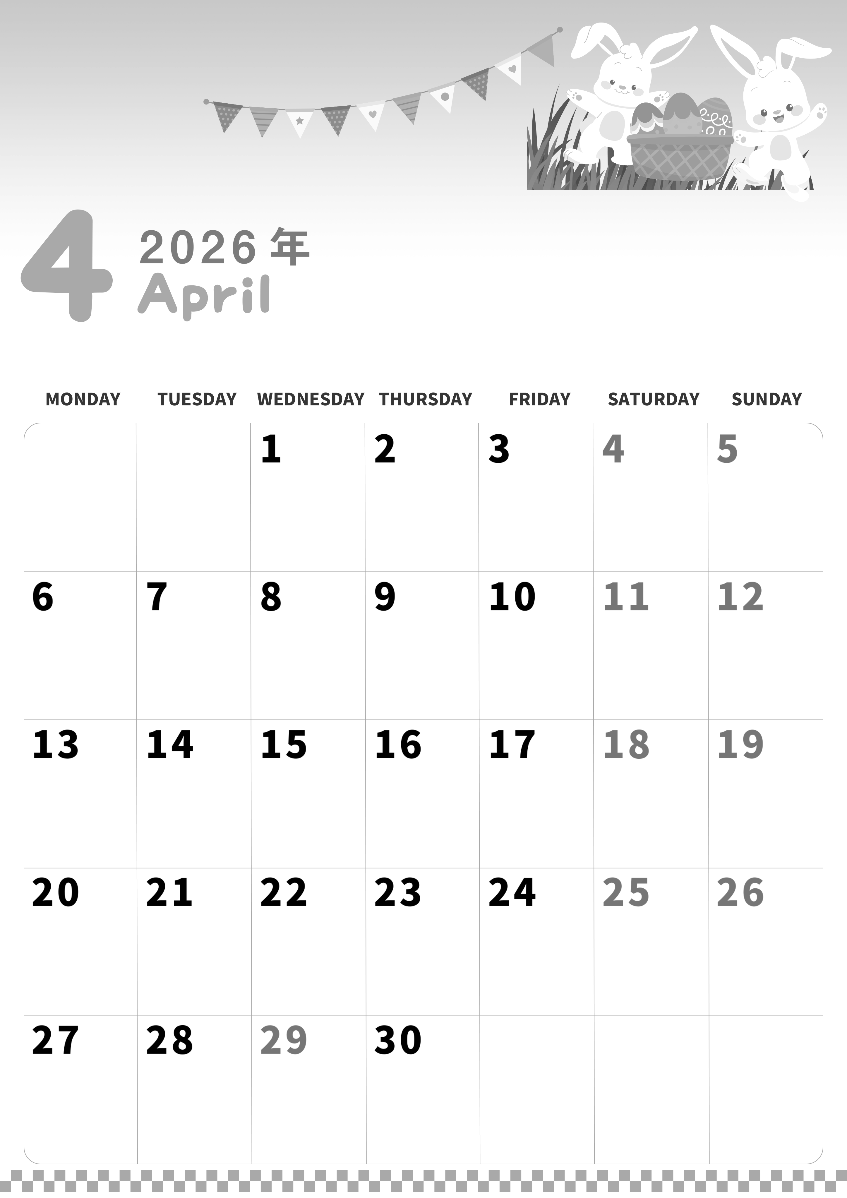 2026年・無料のカレンダーテンプレート 2026年4月縦型モノクロの月曜始まり イースターイラストのかわいいA4無料白黒カレンダー(2026-00310411) 素材状デザイン王 2025年4月1日 2026年4月縦型モノクロの月曜始まりの無料テンプレート白黒カレンダーです。模様が凝っているイースターエッグがかわいい白黒カレンダーとなっています。月曜始まりなので使いやすく目に優しいです。(2026-00310411) 4月 縦型のカレンダー 月曜始まり 白黒 カレンダーデザイン-0031