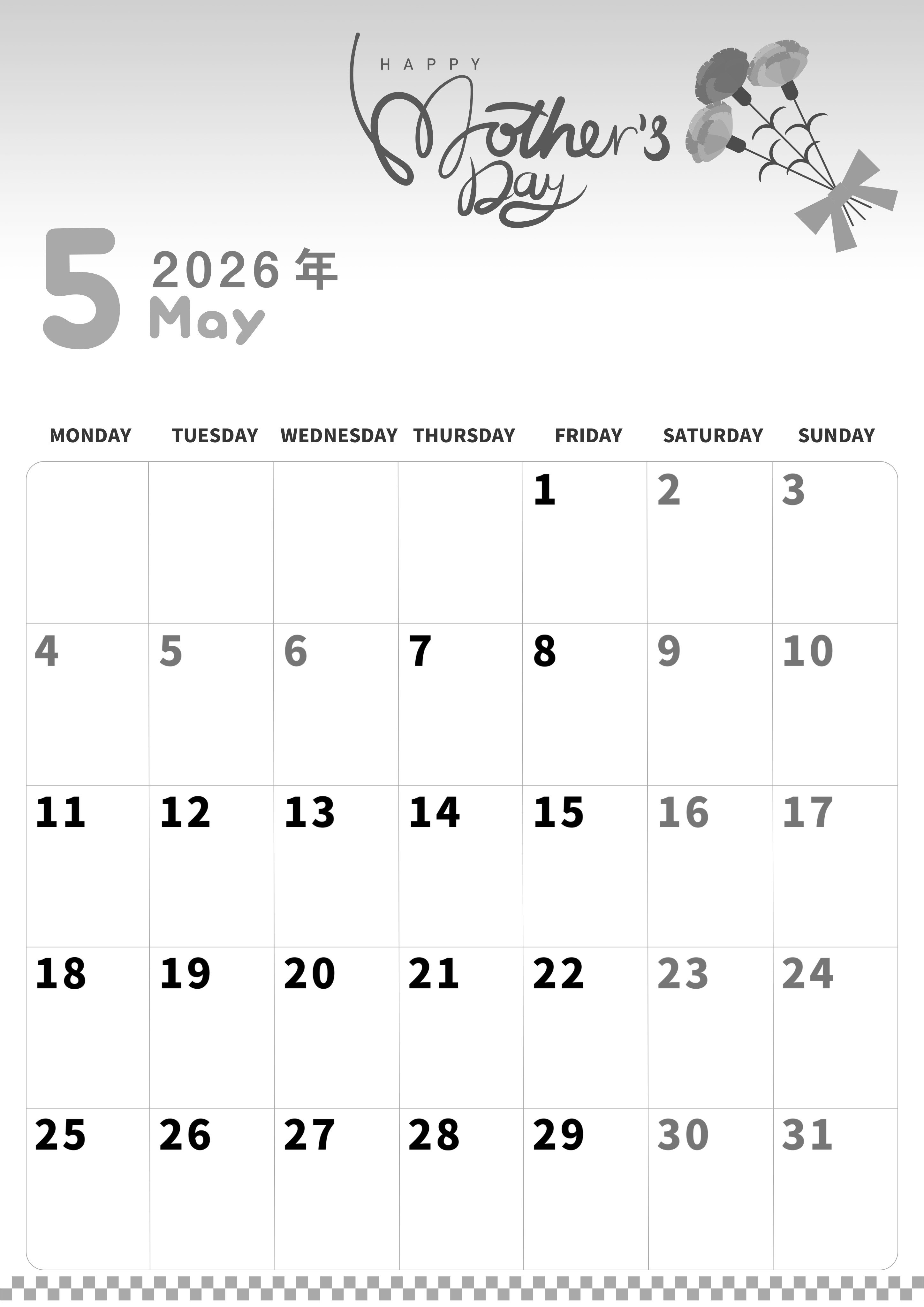 2026年5月縦型モノクロの月曜始まりの無料テンプレート白黒カレンダーです。白黒カレンダーは月曜始まりがイイという方におすすめのフリー素材です。カーネーションのイラストがかわいいので計画を立てるのも楽しくなります。(2026-00310511)