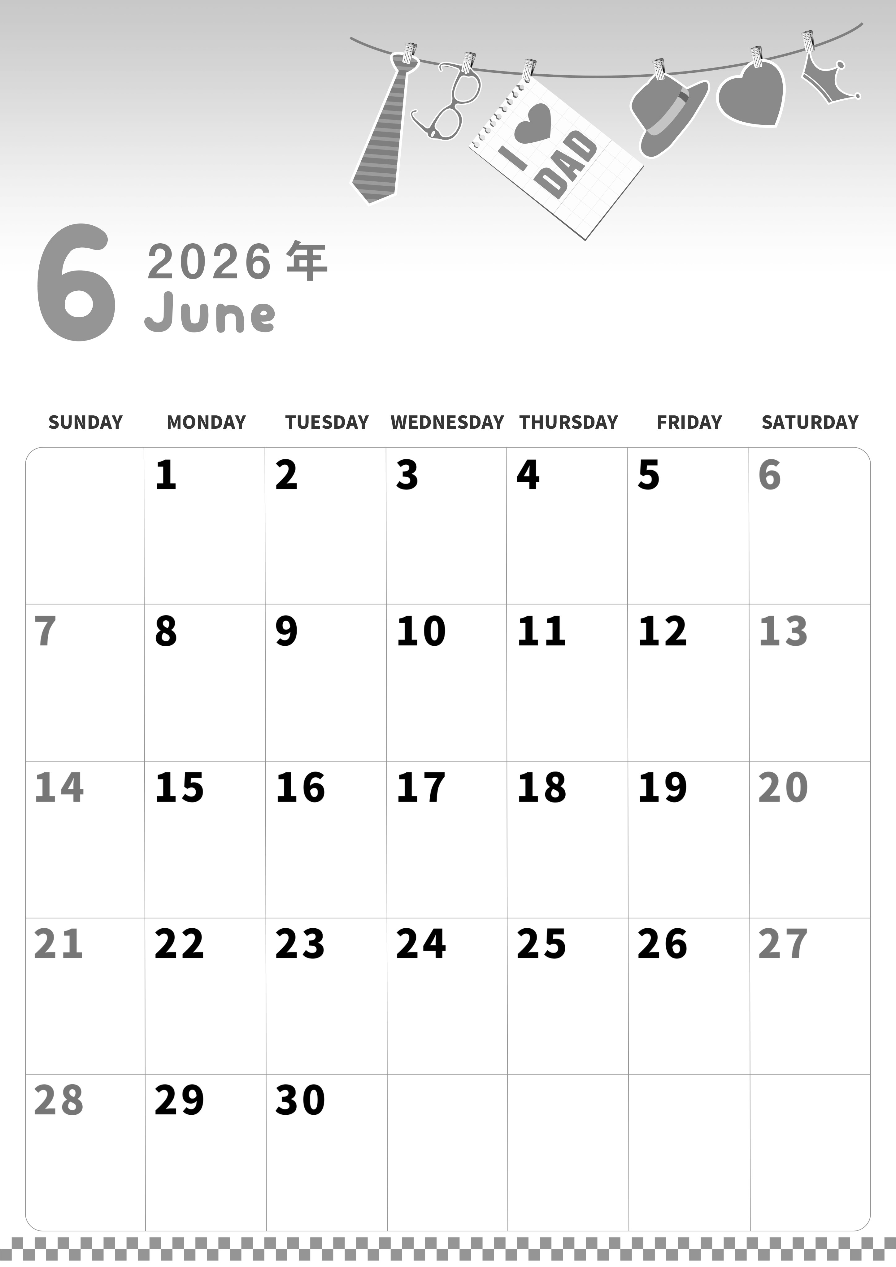 2026年6月縦型モノクロの日曜始まりの無料テンプレート白黒カレンダーです。6月には父の日があります。普段お世話になっているお父さんに対する感謝の気持ちがこもったかわいいイラスト白黒カレンダーです。(2026-00310610)