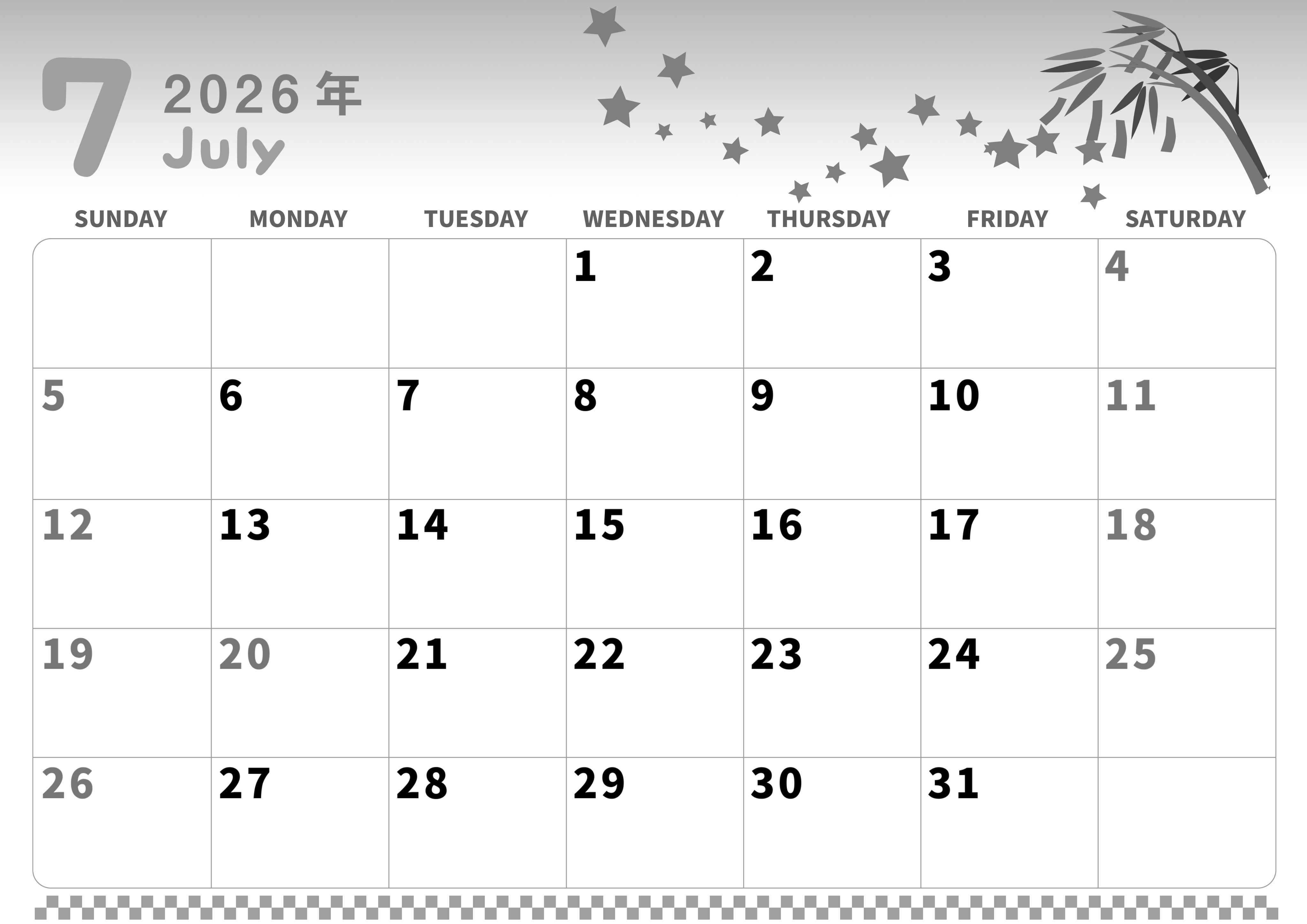 2026年・無料のカレンダーテンプレート 2026年7月横型モノクロの日曜始まり 短冊イラストのかわいいA4無料白黒カレンダー(2026-00310700) 素材状デザイン王 2025年4月1日 2026年7月横型モノクロの日曜始まりの無料テンプレート白黒カレンダーです。色々な願い事が書かれているであろう夢の詰まった短冊のイラストがとてもかわいい季節感っぷりの無料白黒カレンダーです。(2026-00310700) 7月 横型のカレンダー 日曜始まり 白黒 カレンダーデザイン-0031