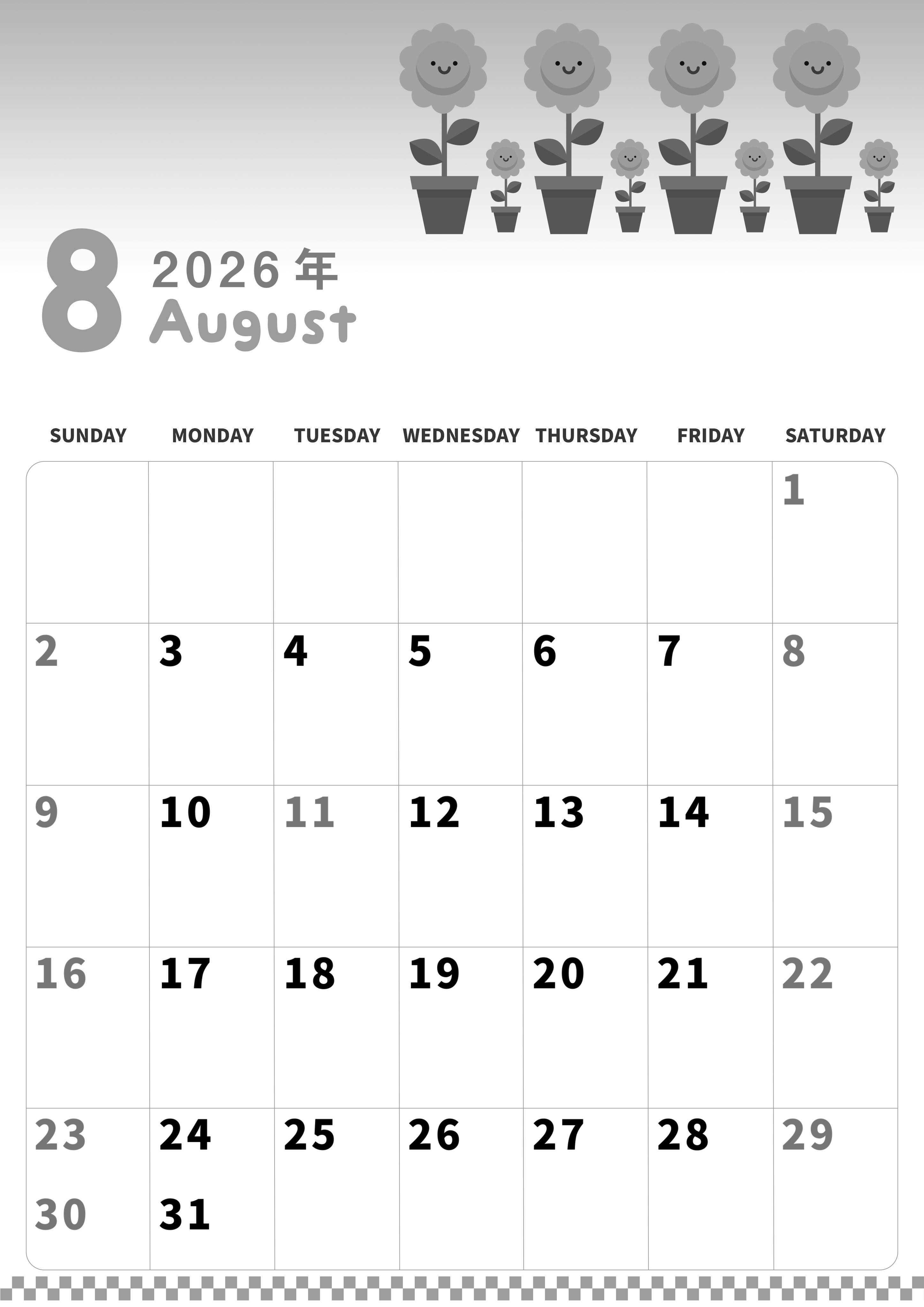 2026年・無料のカレンダーテンプレート 2026年8月縦型モノクロの日曜始まり 季節の花イラストのかわいいA4無料白黒カレンダー(2026-00310810) 素材状デザイン王 2025年4月1日 2026年8月縦型モノクロの日曜始まりの無料テンプレート白黒カレンダーです。笑顔でポジティブな生命力を感じさせる季節の花であるヒマワリのイラストがかわいいです。オリジナルデザインで無料素材です。(2026-00310810) 8月 縦型のカレンダー 日曜始まり 白黒 カレンダーデザイン-0031