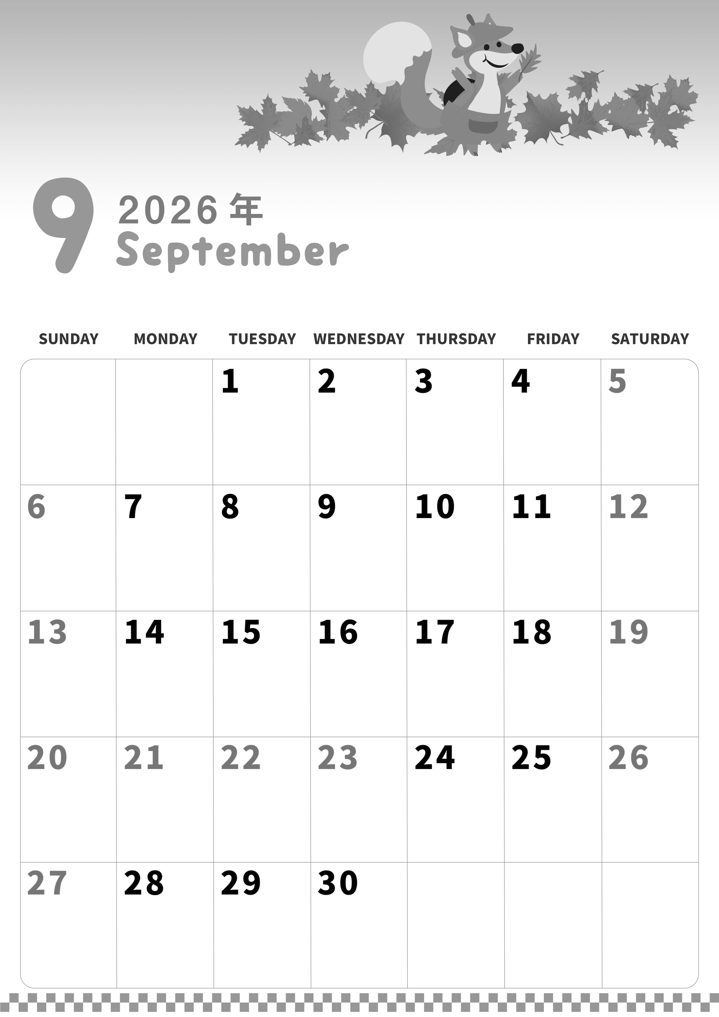 2026年9月縦型モノクロの日曜始まりの無料テンプレート白黒カレンダーです。かわいい子狐がにっこりとしている様子を描いたイラストです。秋のセンチメンタルな気持ちを吹き飛ばしてくれるような世界観です。(2026-00310910)
