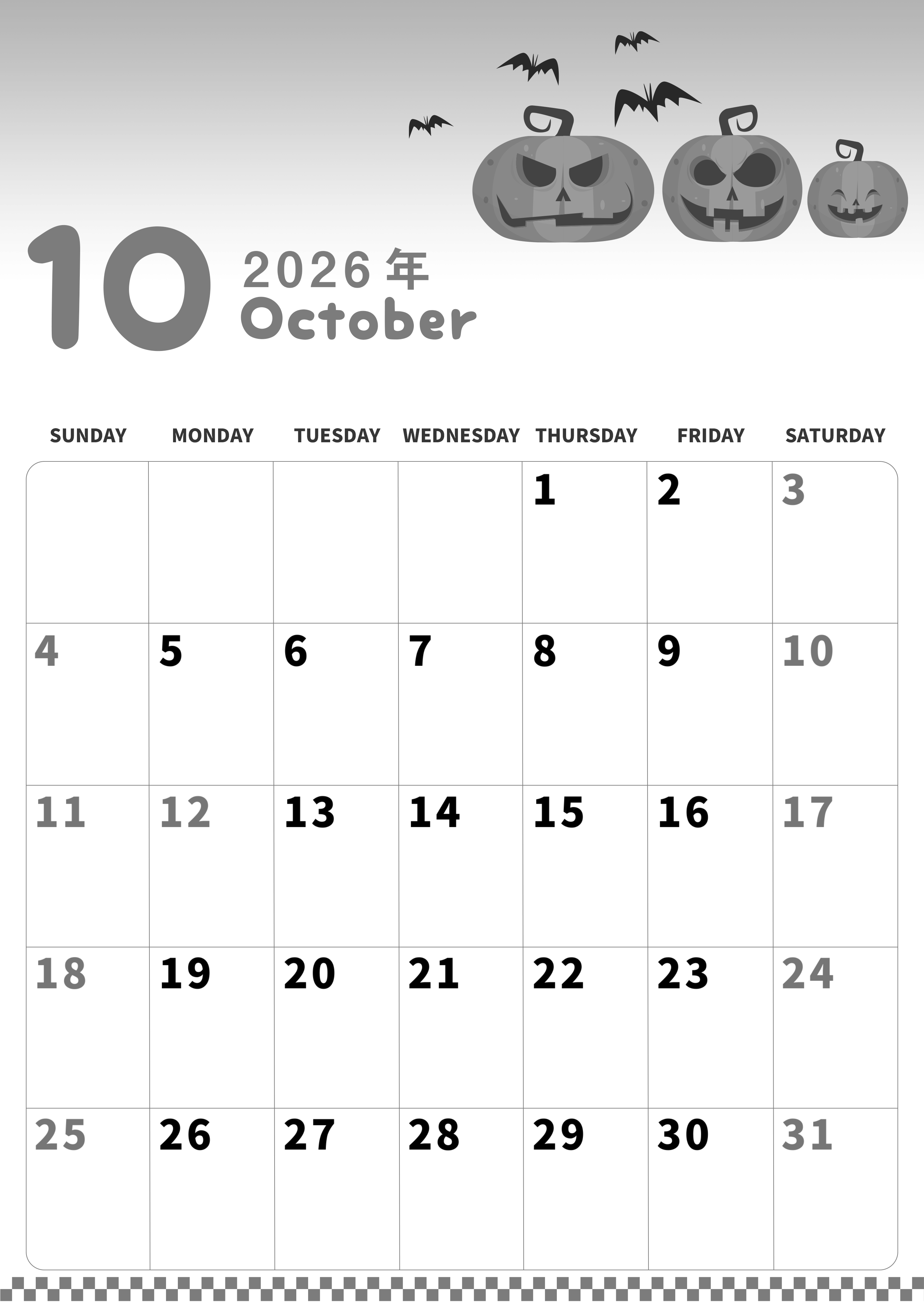 2026年10月縦型モノクロの日曜始まりの無料テンプレート白黒カレンダーです。カボチャのイラストがワンポイントです。文字フォントが丸みを帯びていてかわいいので計画を管理する意欲が湧いてくる素材です。(2026-00311010)