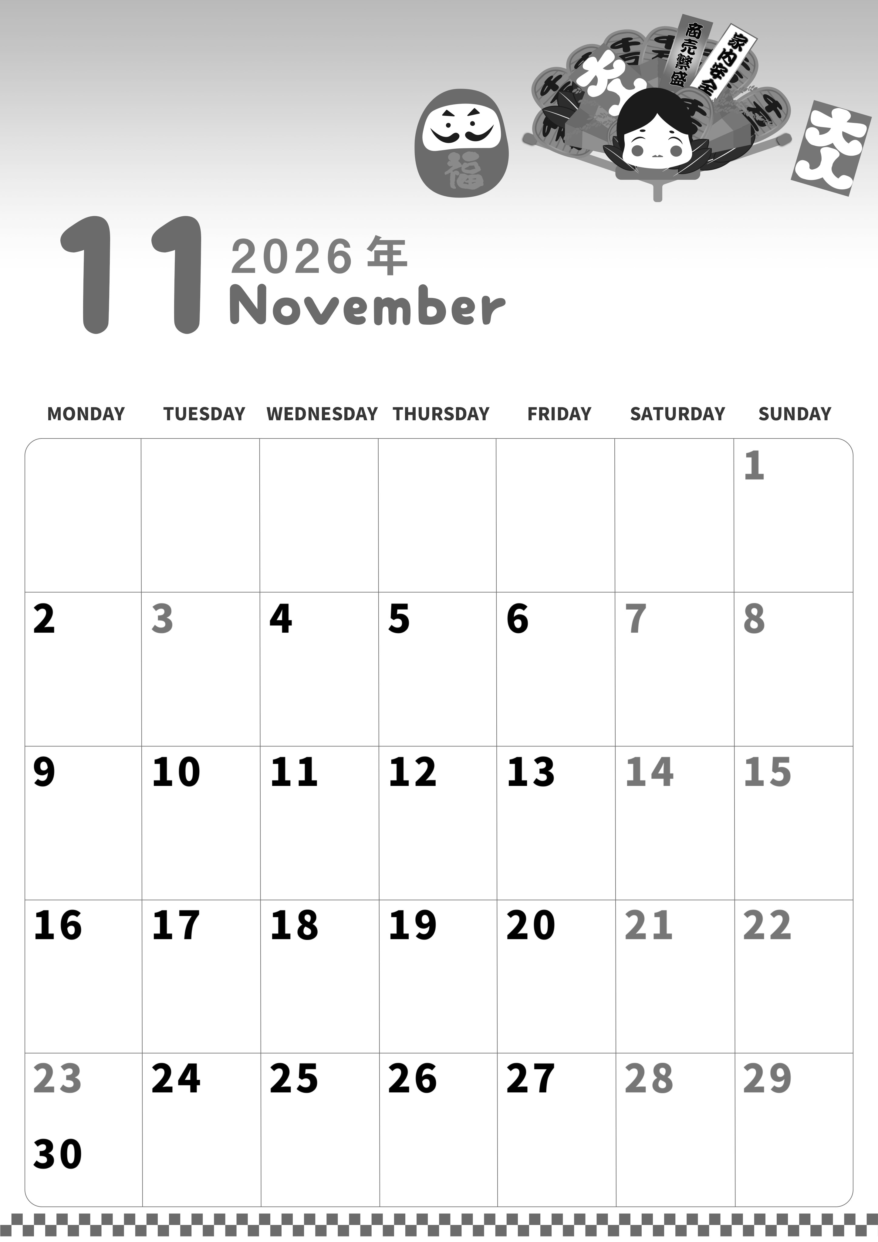 2026年11月縦型モノクロの月曜始まりの無料テンプレート白黒カレンダーです。だるまが主役のイラストです。白黒カレンダー全体の雰囲気もとてもかわいいので予定を管理するモチベーションアップに繋がります。(2026-00311111)