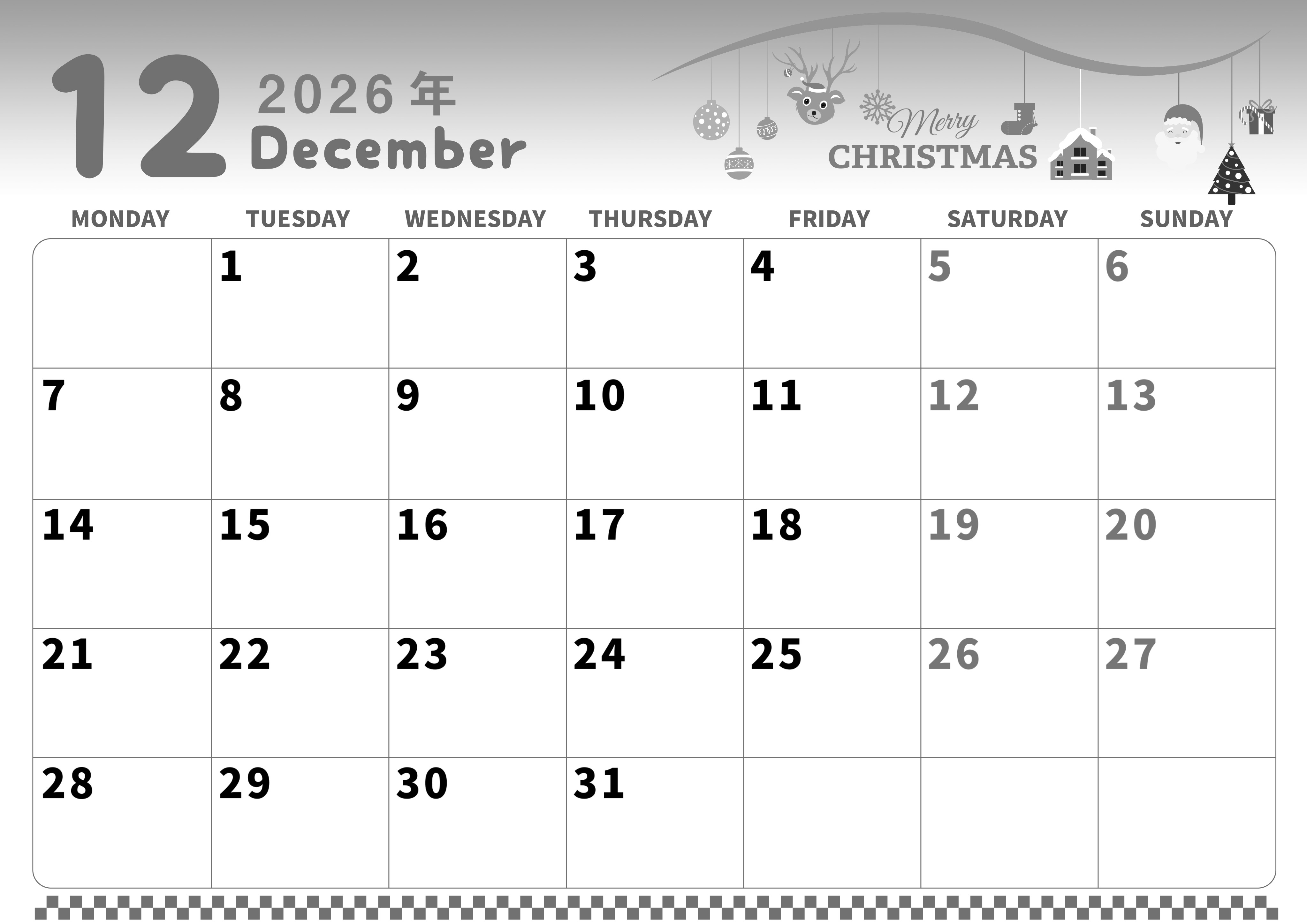 2026年12月横型モノクロの月曜始まりの無料テンプレート白黒カレンダーです。オーナメントが天井からぶら下がっている様子を描いたイラストがクリスマスを表現していてとてもかわいいです。月曜始まりで予定管理に向いています。(2026-00311201)