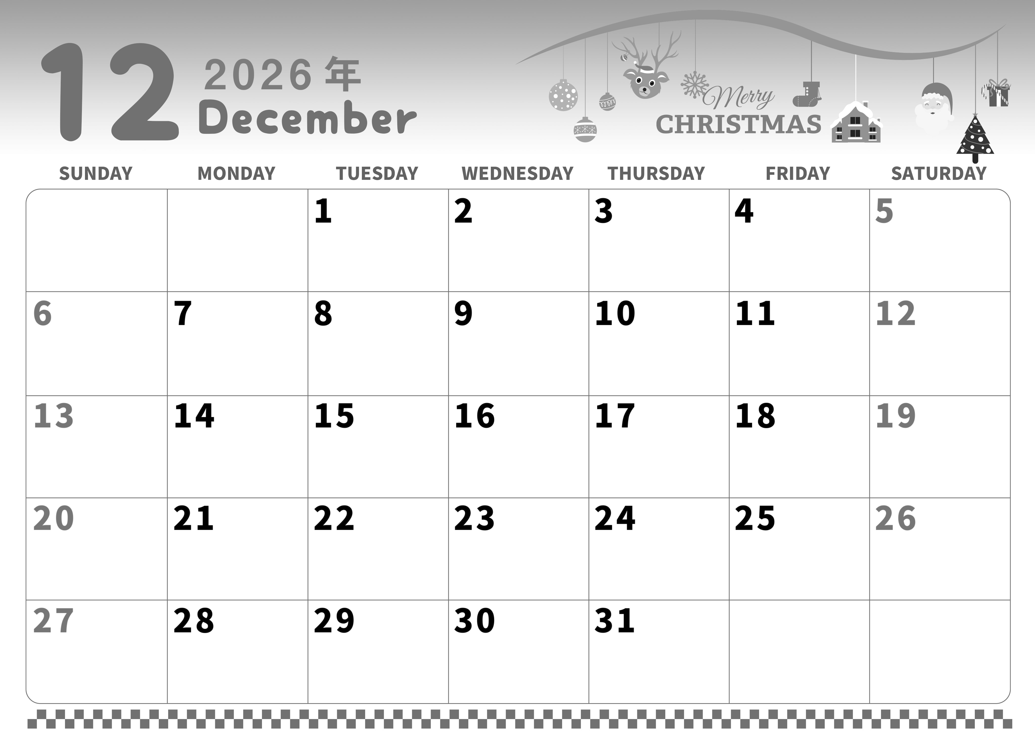 2026年12月横型モノクロの日曜始まりの無料テンプレート白黒カレンダーです。グラデーションを背景にクリスマスのワクワク感を盛り上げてくれるバラエティに富んだデザインのオーナメントがかわいいイラストです。(2026-00311200)