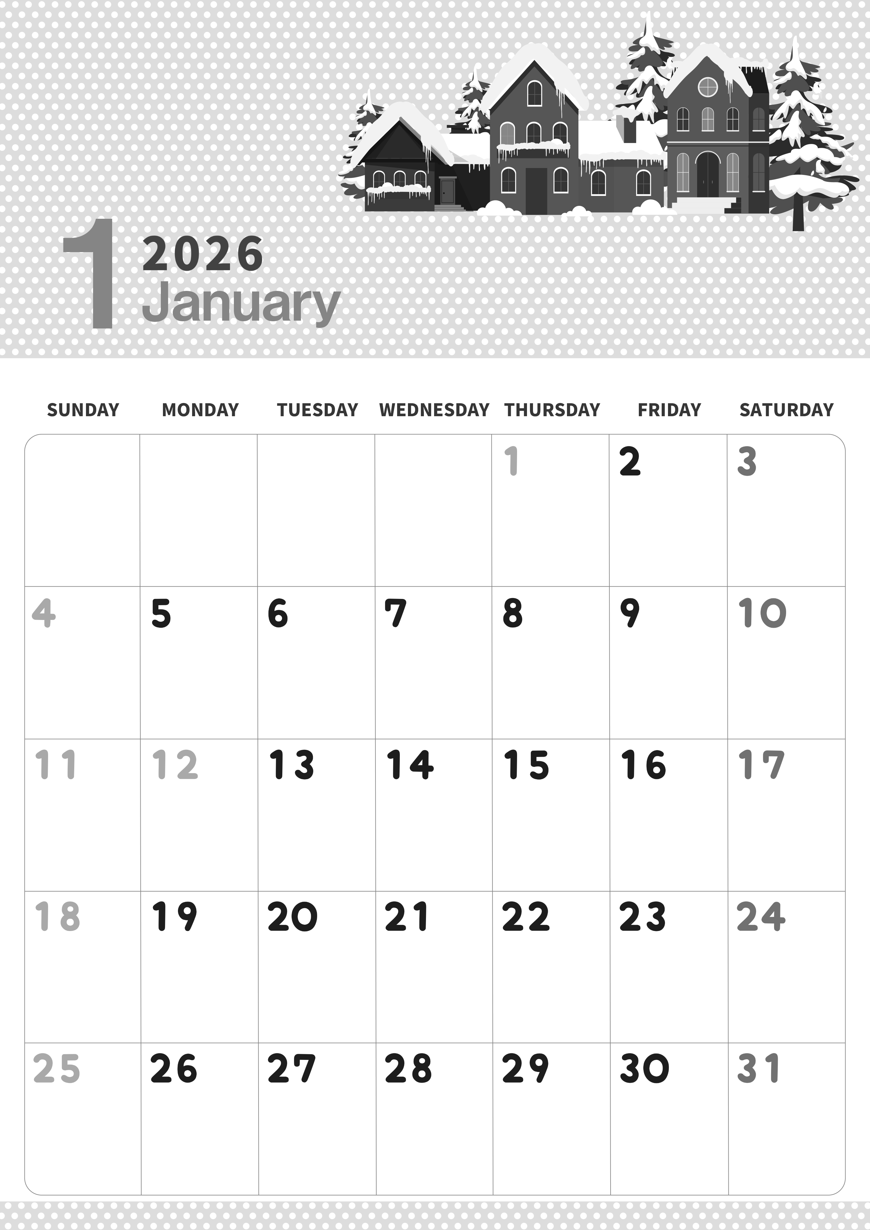 2026年1月縦型モノクロの日曜始まり白黒カレンダーです。オリジナル画像は北欧のとある住宅街を連想させるような静かでおだやかな雪景色です。無料でおしゃれな白黒カレンダーをタスク管理に活用出来るのでダウンロードしましょう。(2026-00320110)