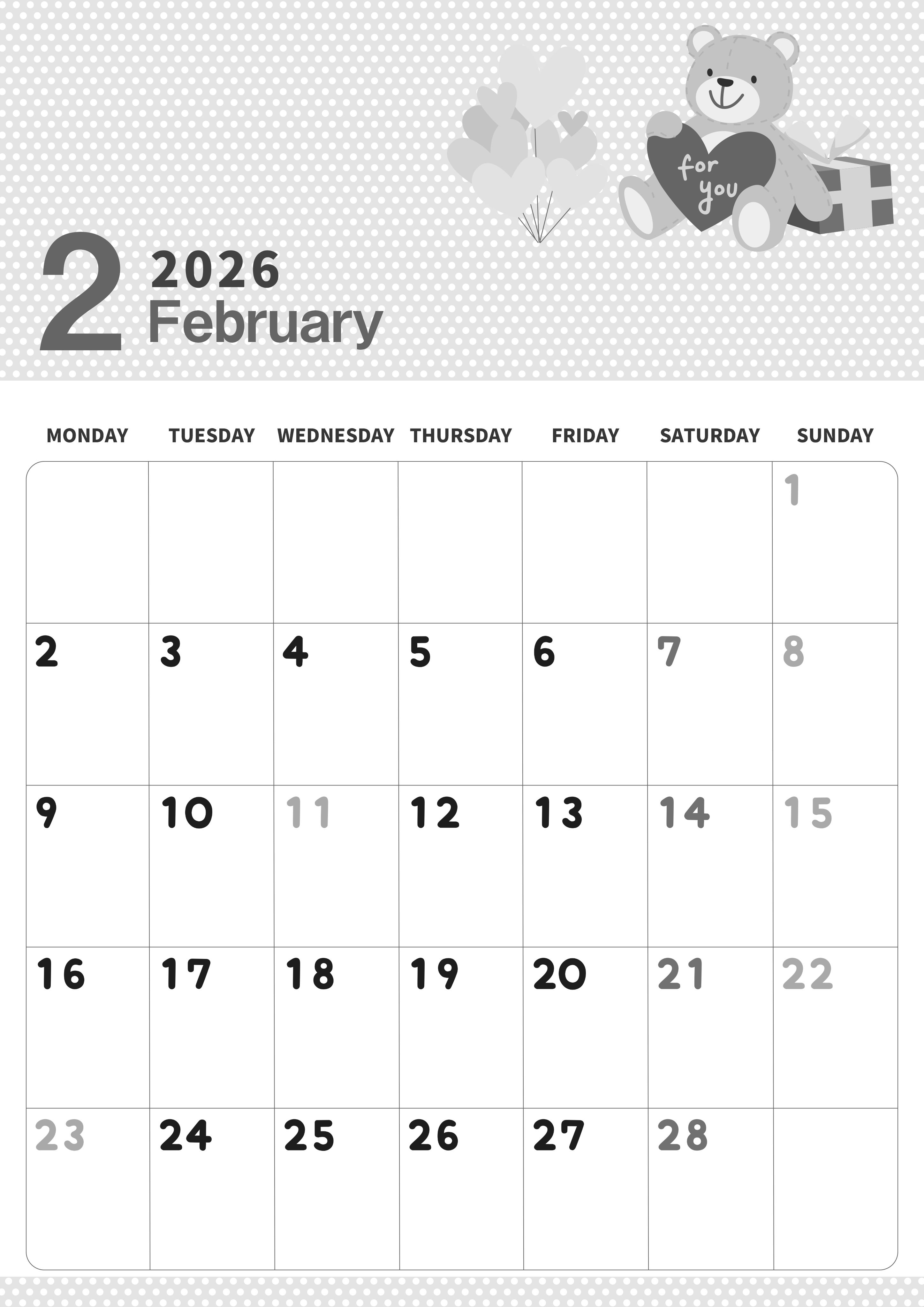 2026年2月縦型モノクロの月曜始まりの無料テンプレート白黒カレンダーです。クマとハートがアクセントになっている全体的にガーリーな白黒カレンダーでとてもおしゃれなデザインです。月曜始まりのフリー素材です。(2026-00320211)